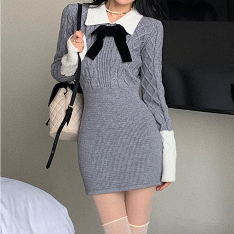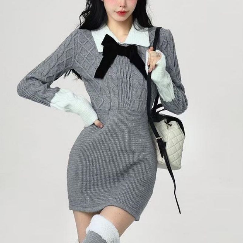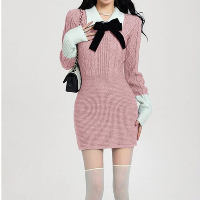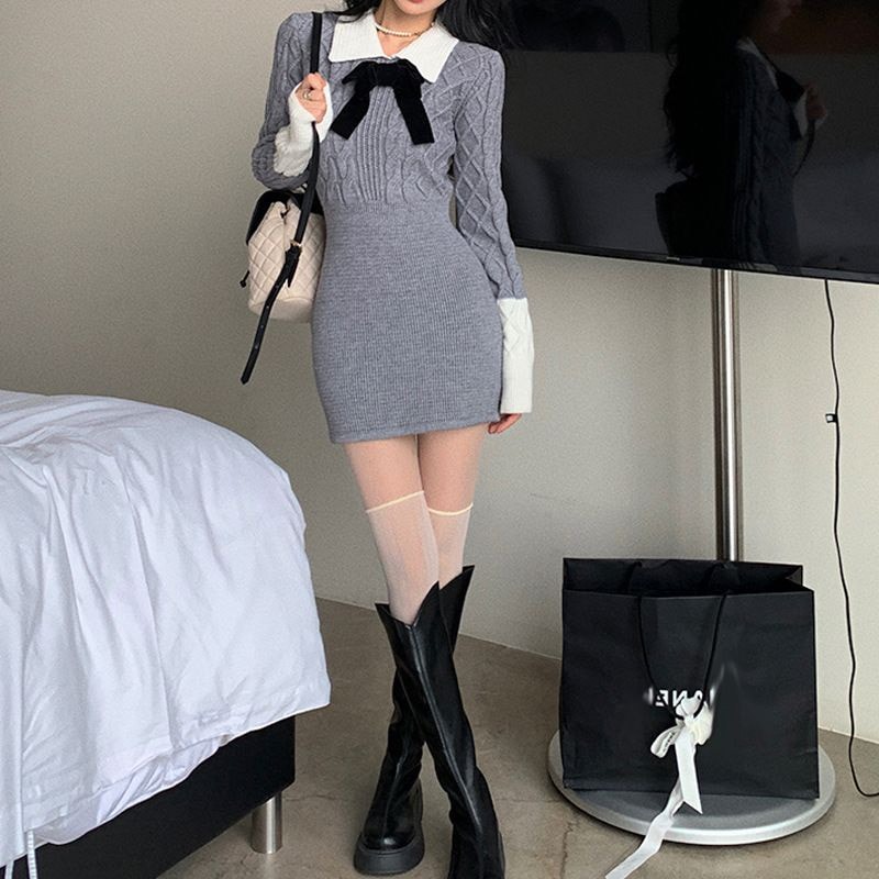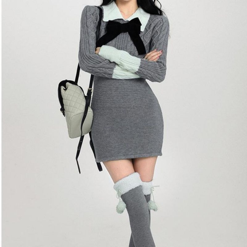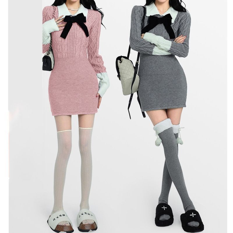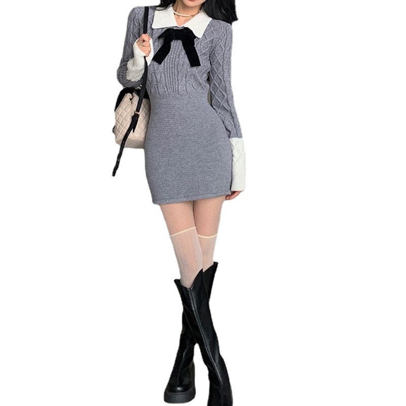 カラコンqoo10アヌアパックアイシャドウ学院風セーターワンピース女性韓国版春装スカートに長袖ニットスカートを掛けてお尻のスカートを包む ニットワンピ