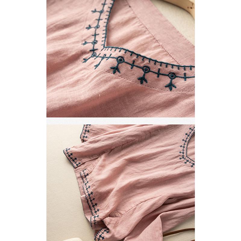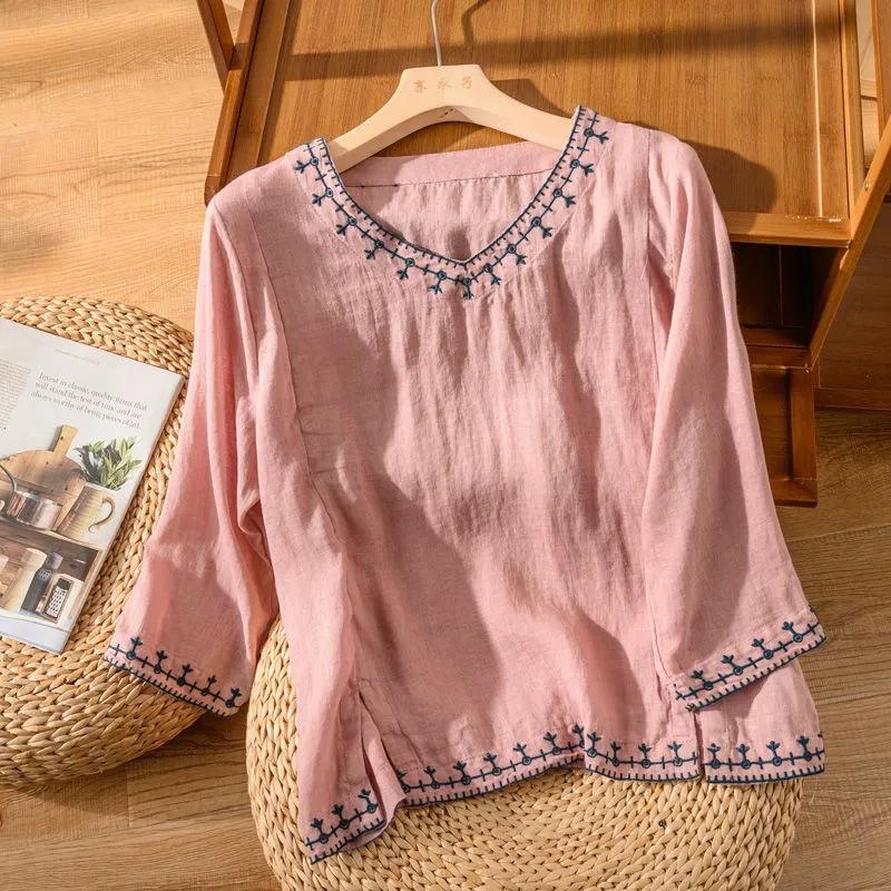 レディース ファッション 棉混紡 コットン 七分袖 無地 刺繍 棉麻 春秋 羽織り レトロ大人 体型カバー ビッグ フェミニン Tシャツ カットソー