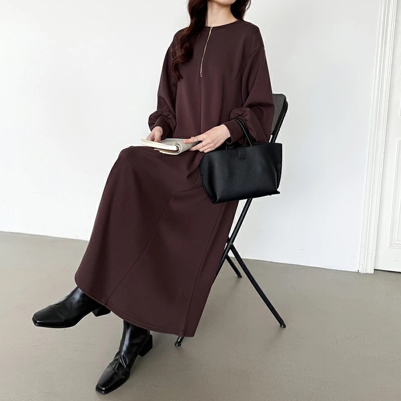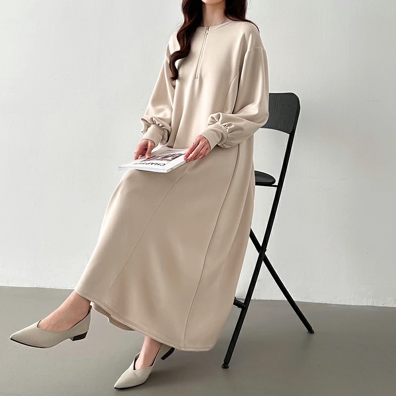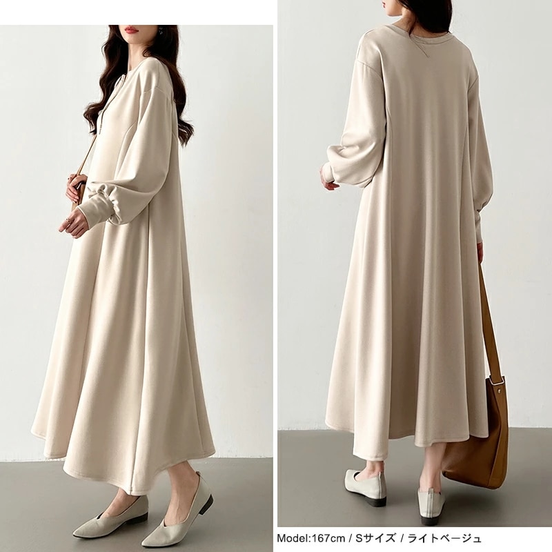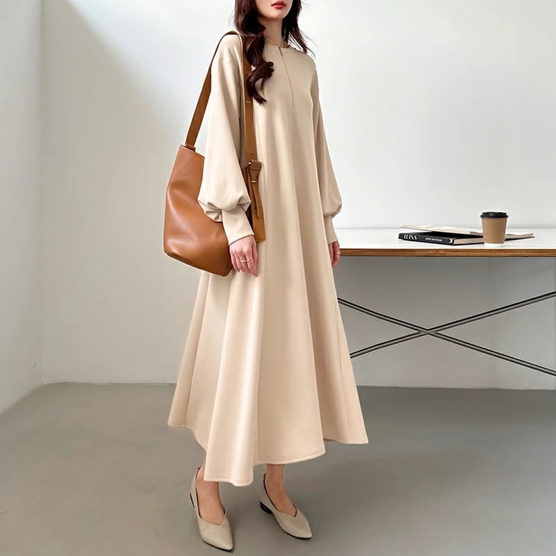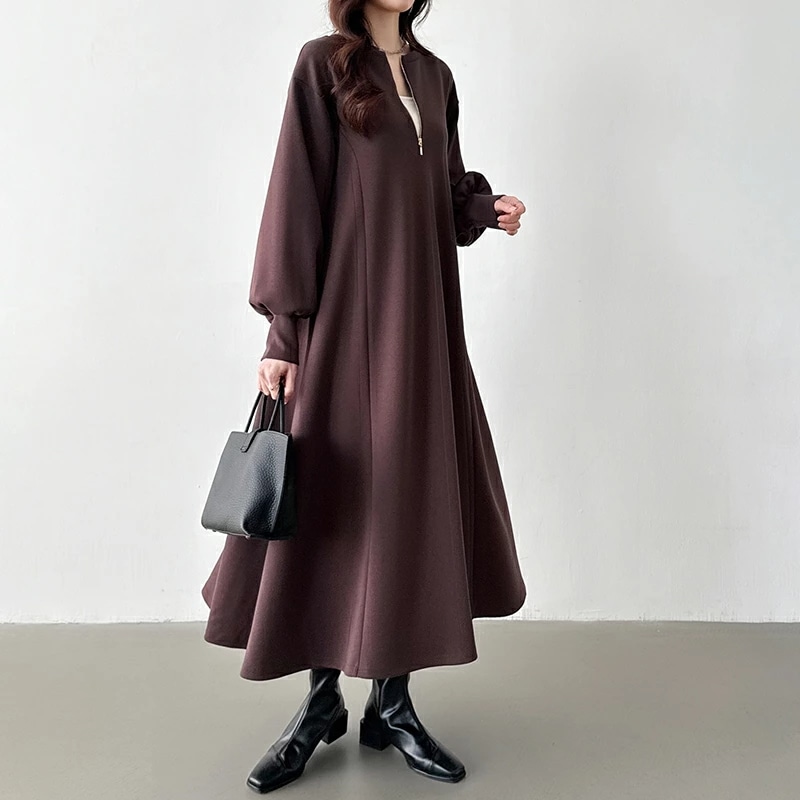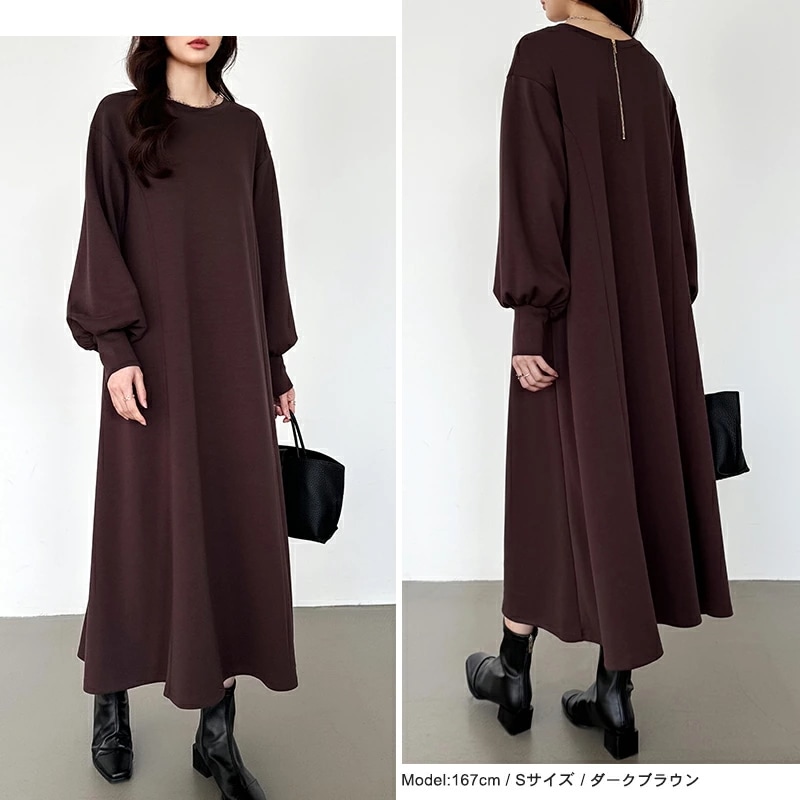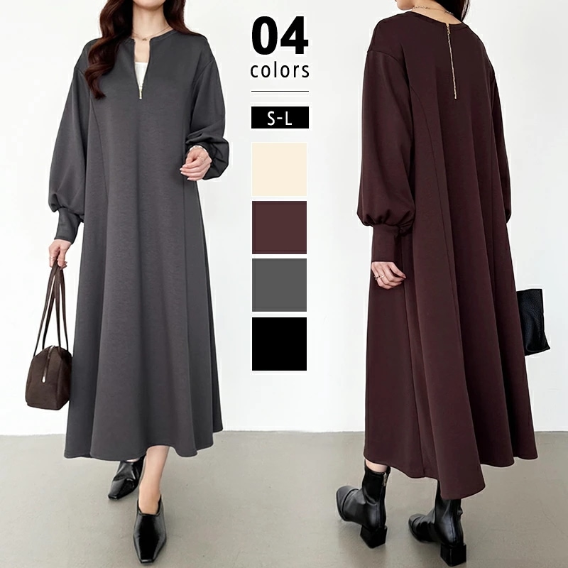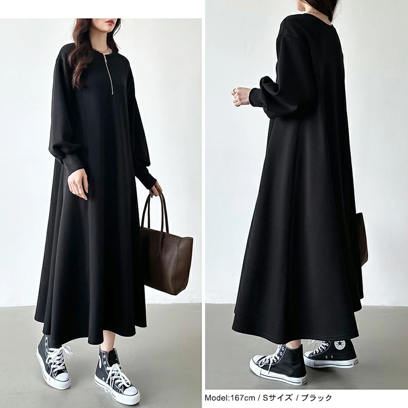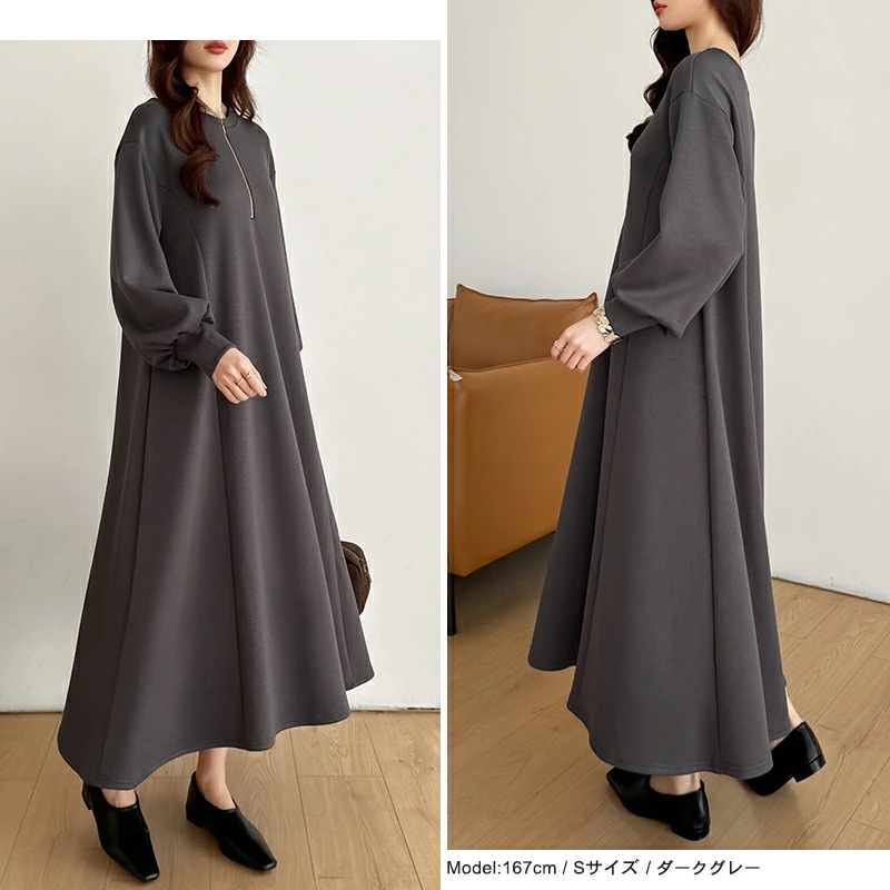 ハーフジップワンピース 前後2way ロングワンピース フレアワンピース ハーフジップ ワンピース 長袖 レディース ロング カジュアル ボリューム袖 大きいサイズ