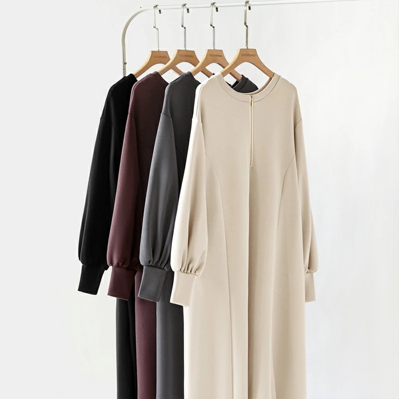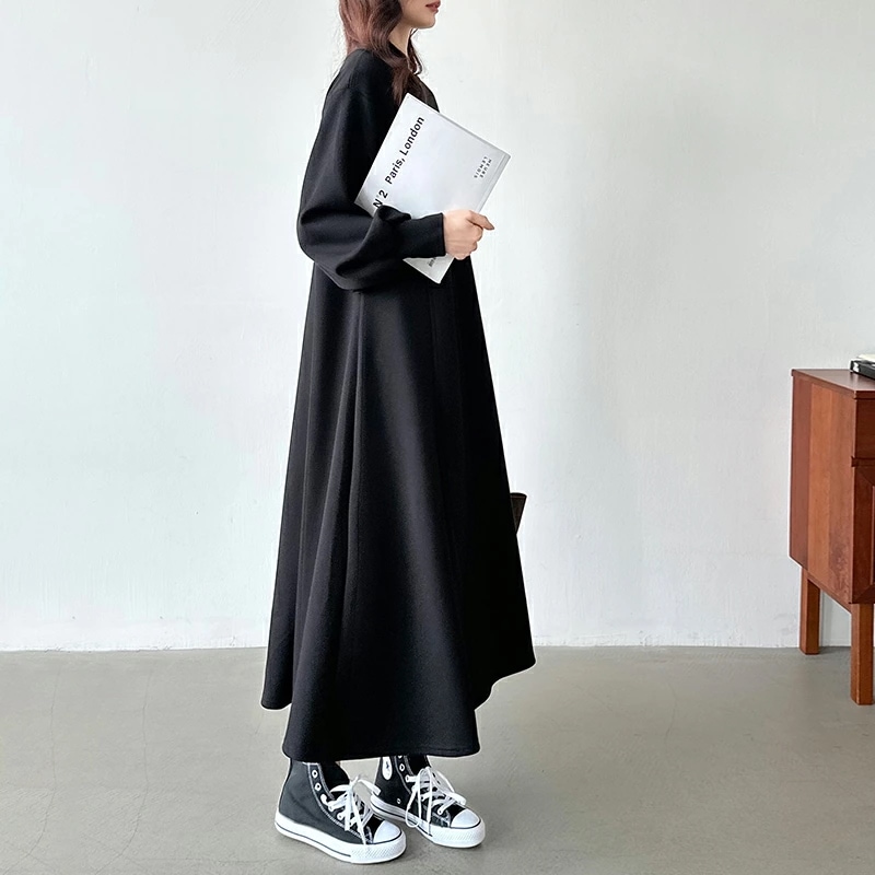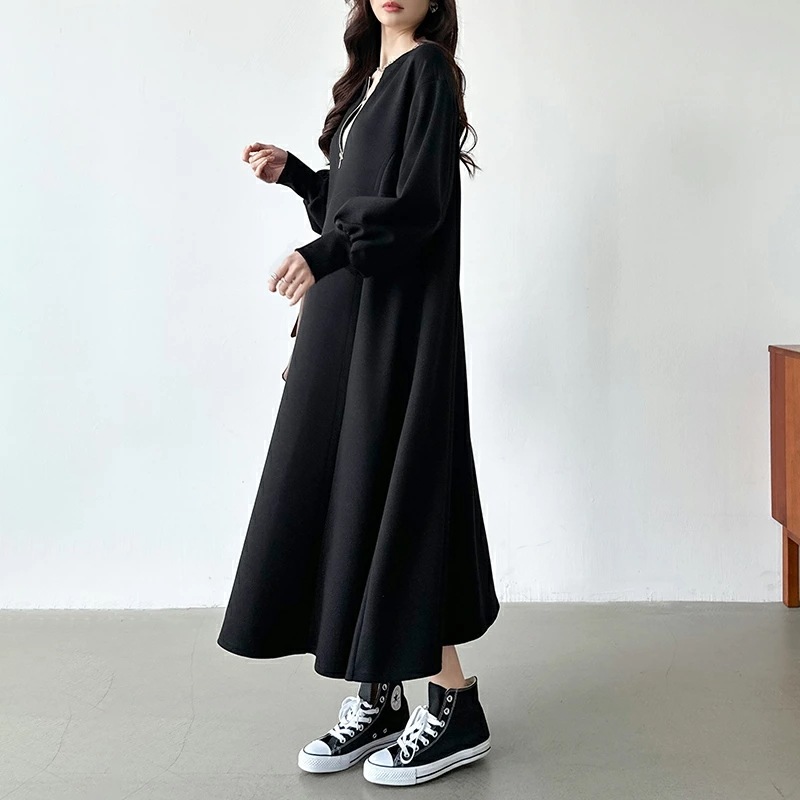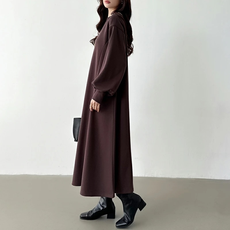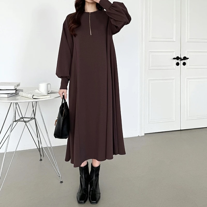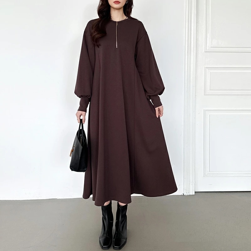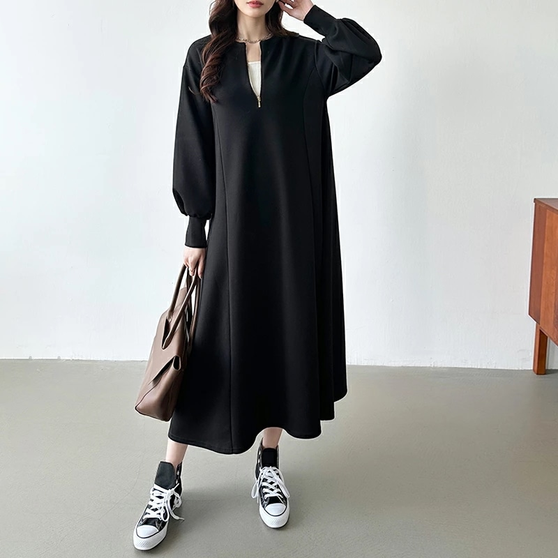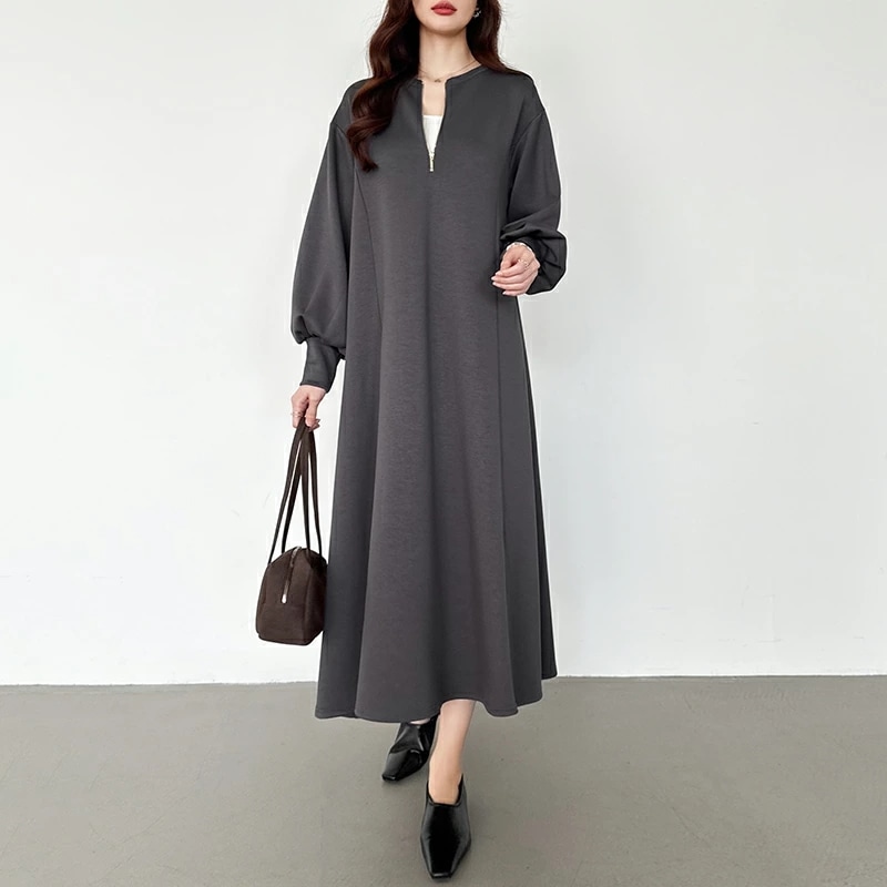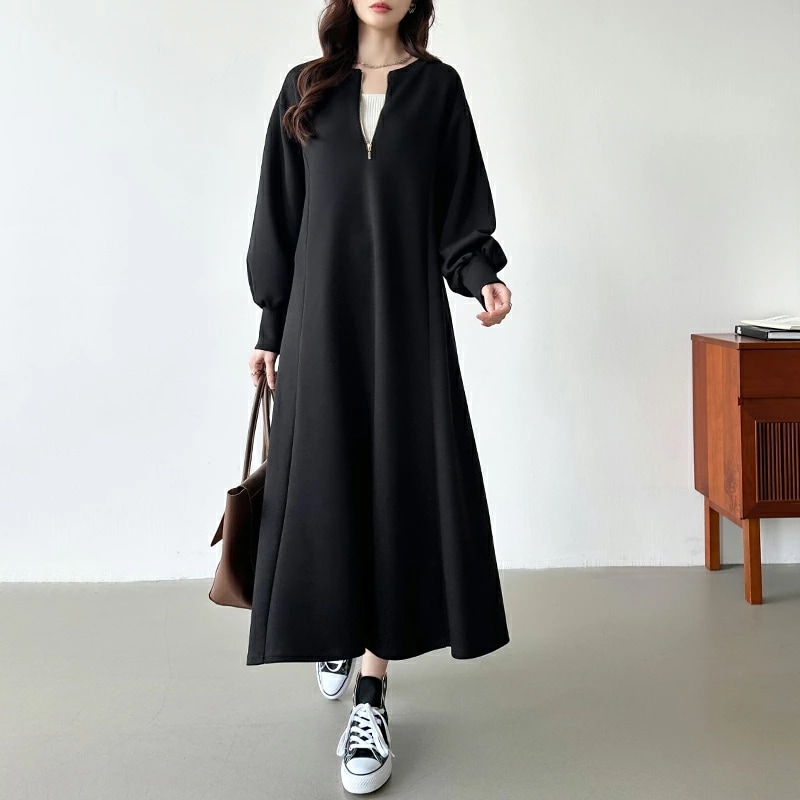 ハーフジップワンピース 前後2way ロングワンピース フレアワンピース ハーフジップ ワンピース 長袖 レディース ロング カジュアル ボリューム袖 大きいサイズ