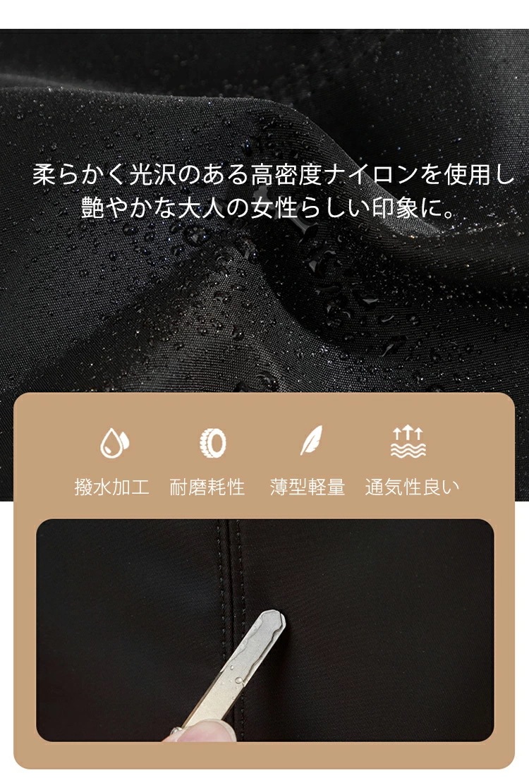・撥水・防汚加工―水を弾くのに加え、汚れが付きにくい特殊な素材を使用。突然の雨やうっかりこぼしたコーヒーもサッと一拭きで元通り。効果的に水の浸透を防ぎ、バックの中身を保護します。