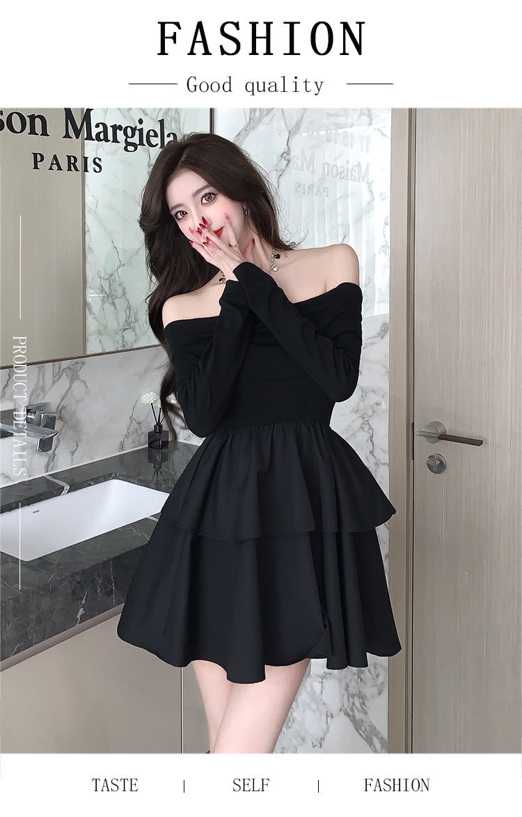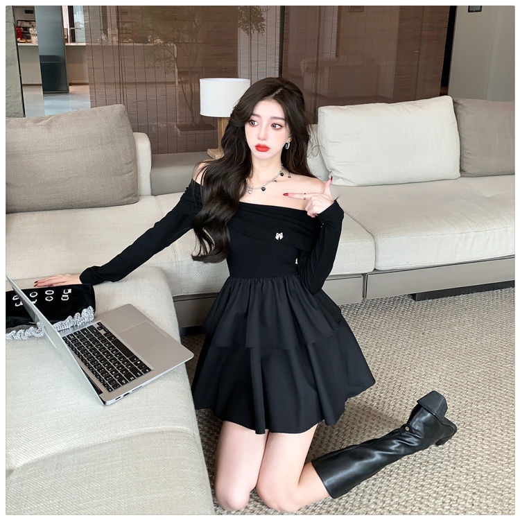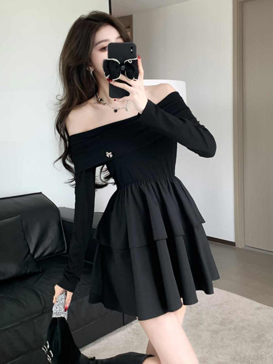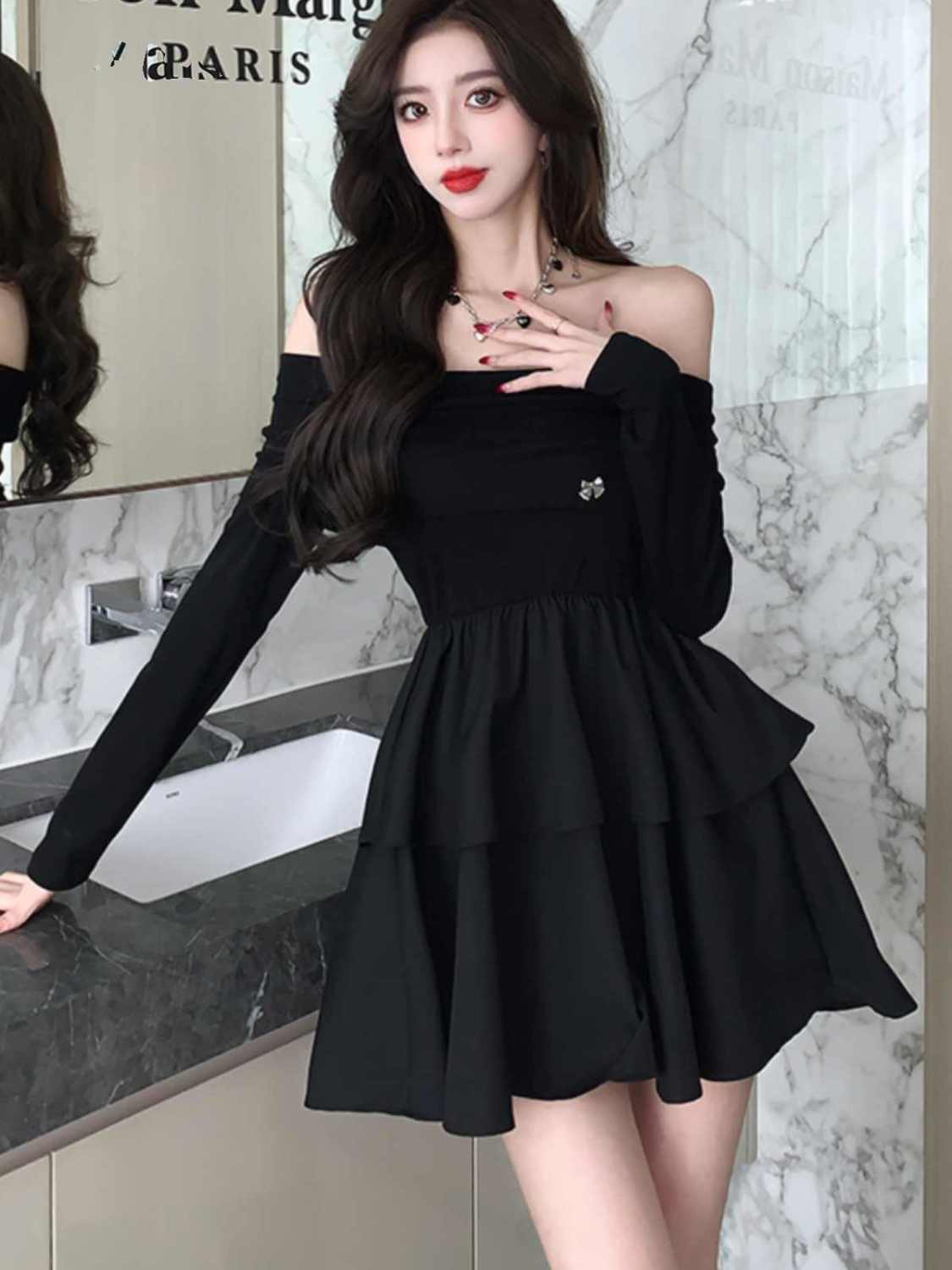 パーティードレス 長袖黒ワンピース春取り入れウエストケーキスカート上品a字スカート肩出しスカート ドレス