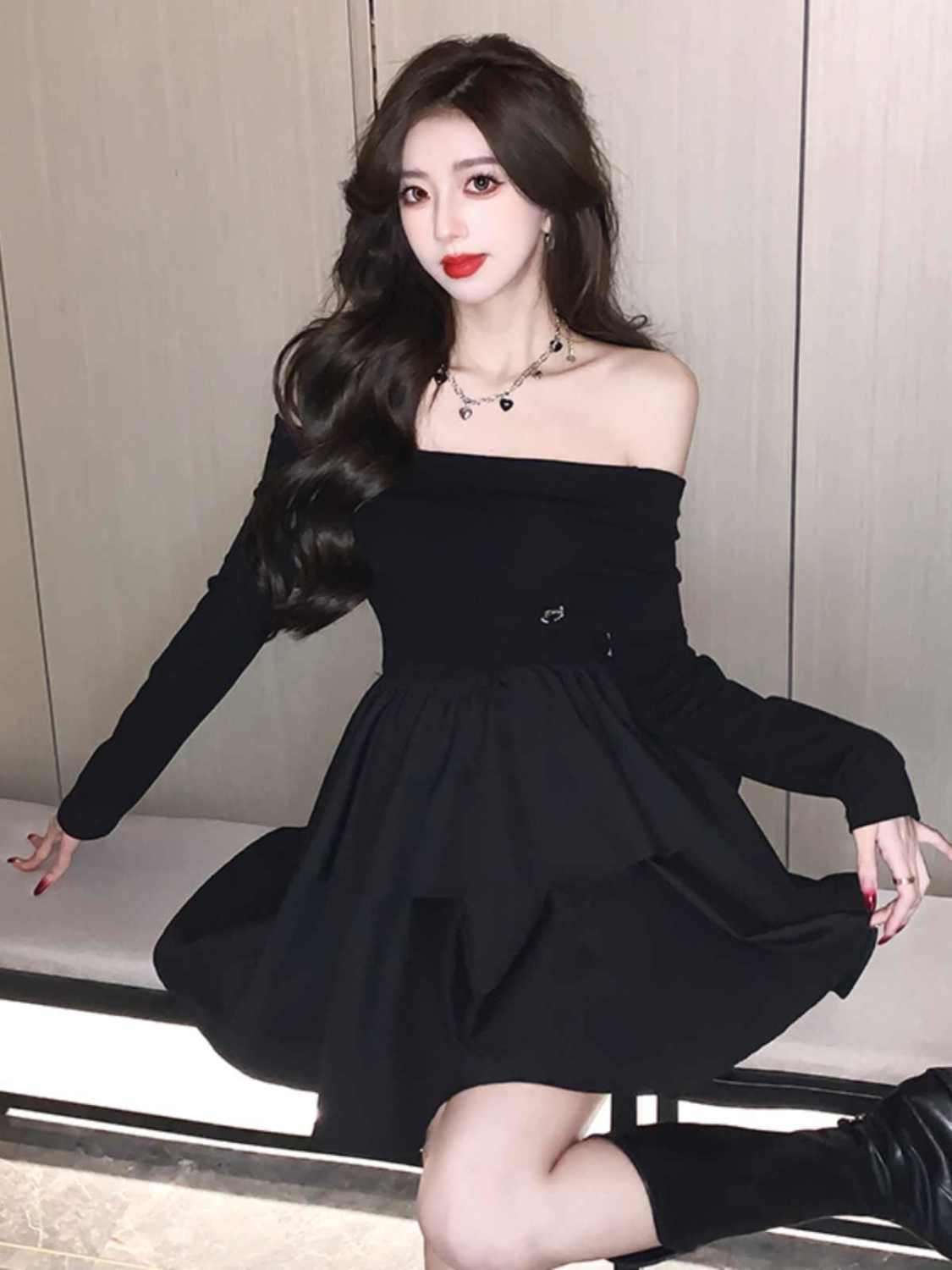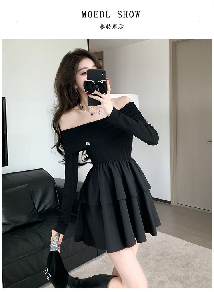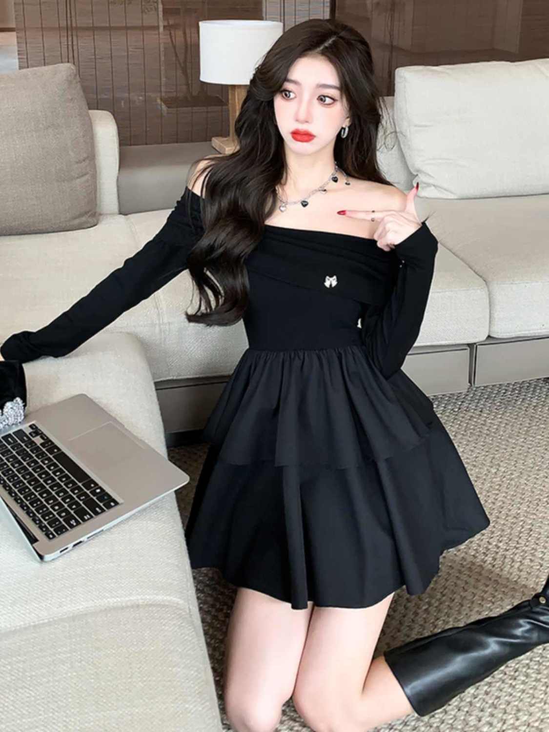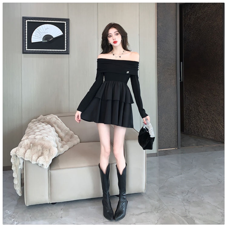 パーティードレス 長袖黒ワンピース春取り入れウエストケーキスカート上品a字スカート肩出しスカート ドレス