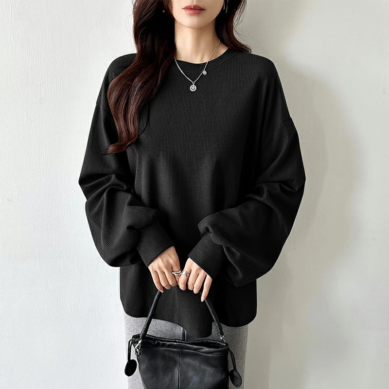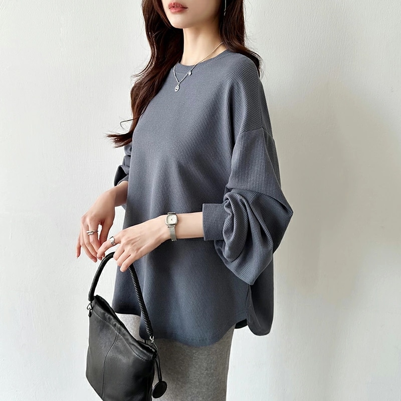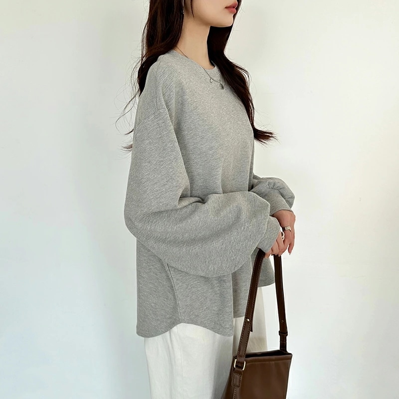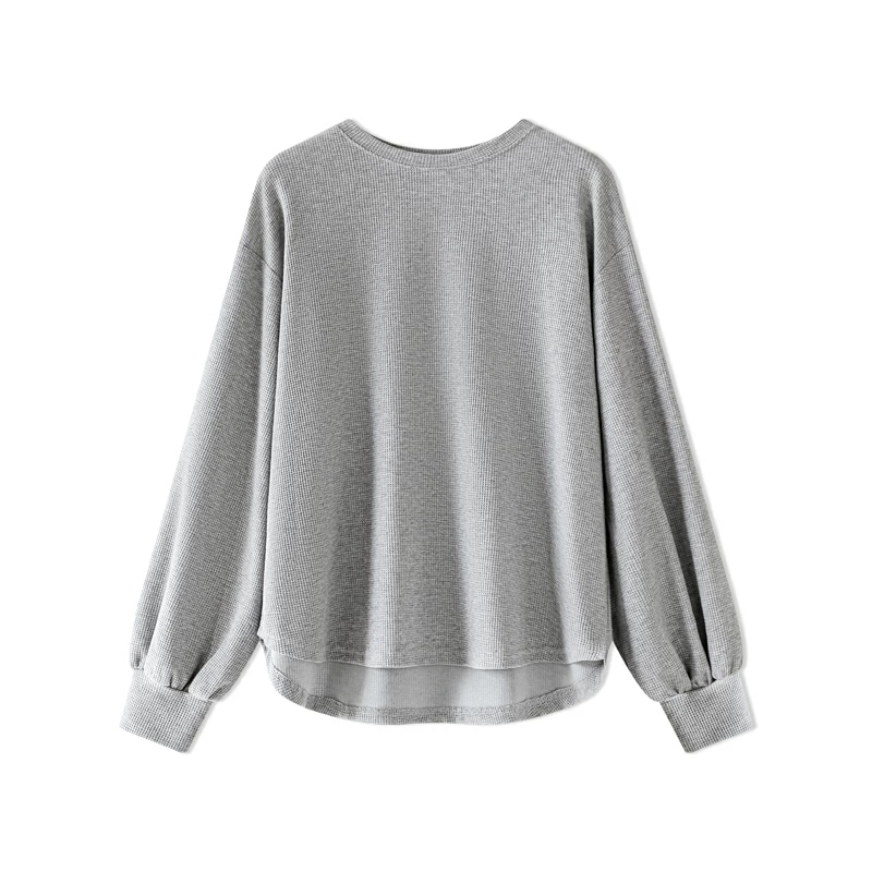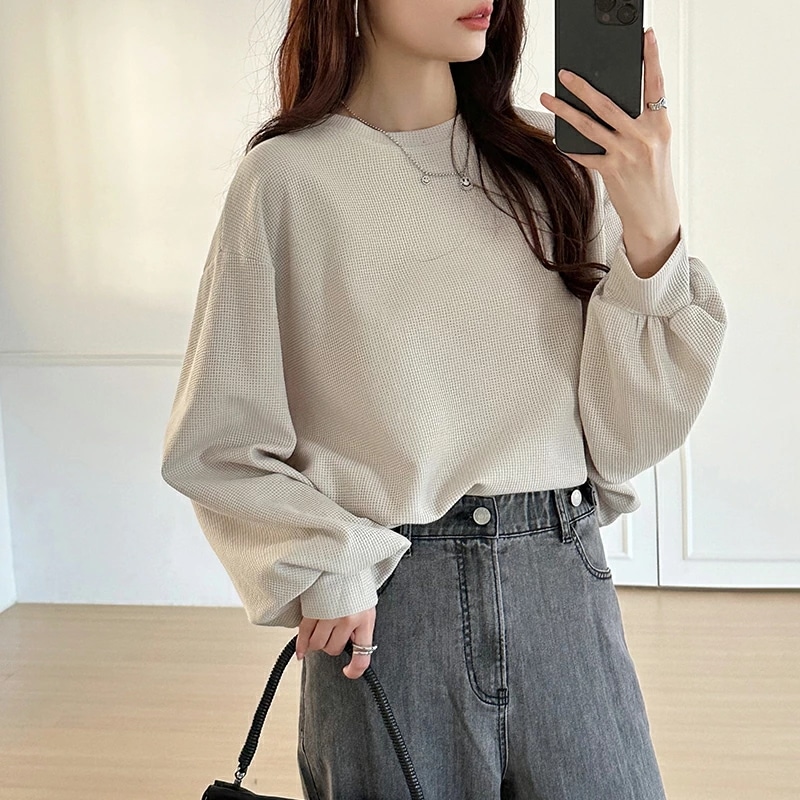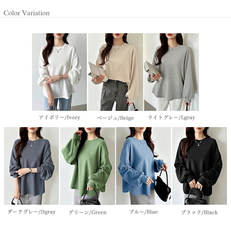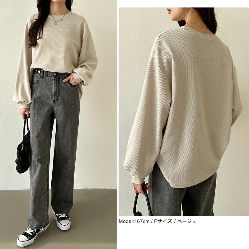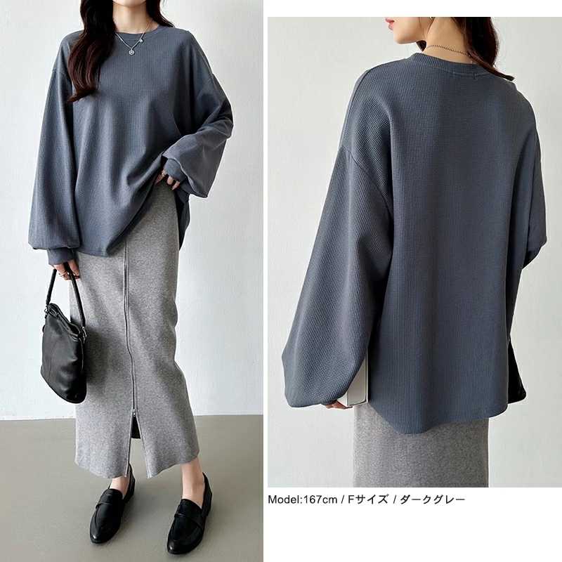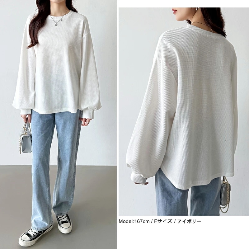 ラウンドヘムワッフルカットソー ボリューム袖 ロンT オーバーサイズ ボリューム袖 ワッフル カットソー 長袖 レディース ゆったり tシャツ トップス ドロップショルダー クルーネック