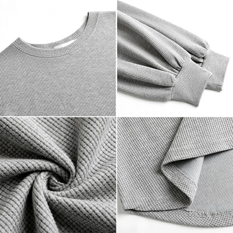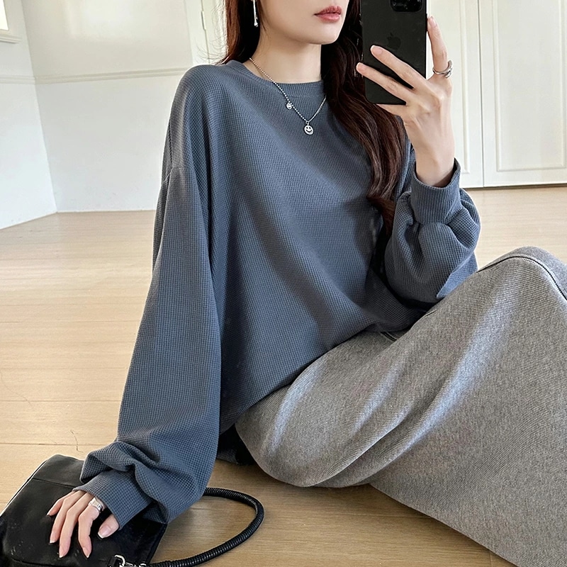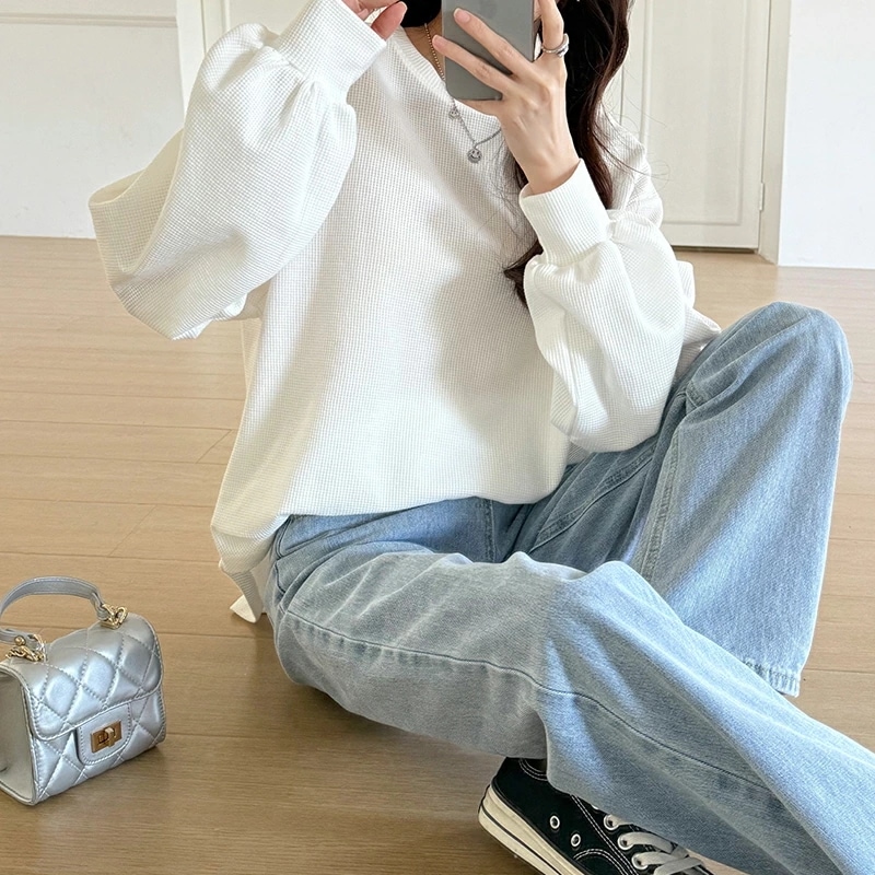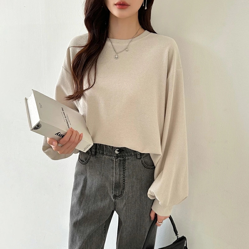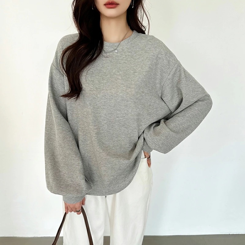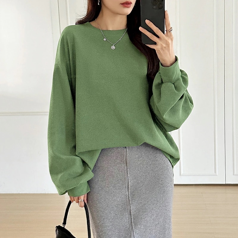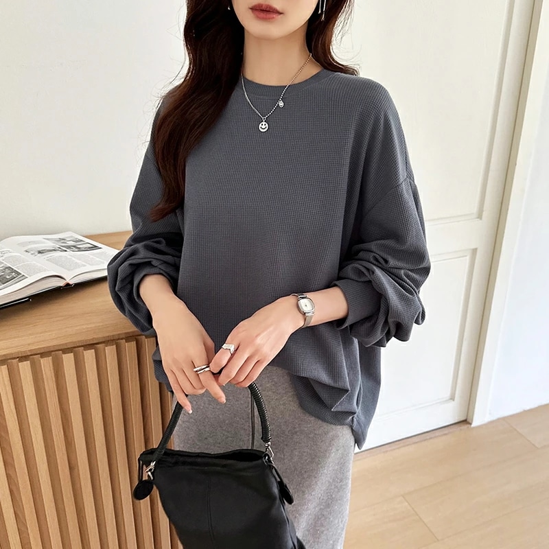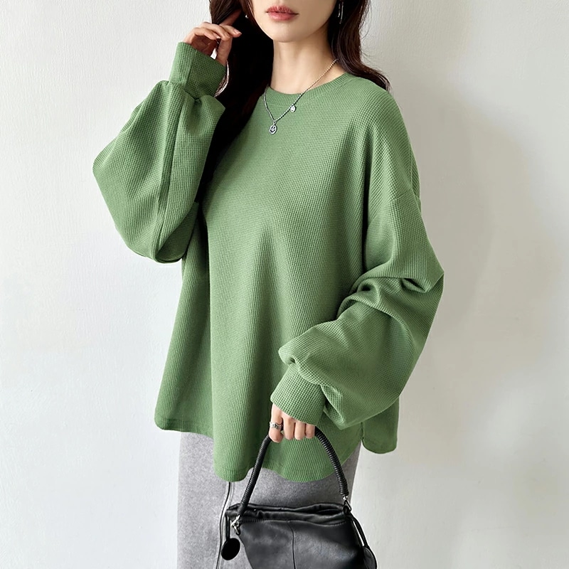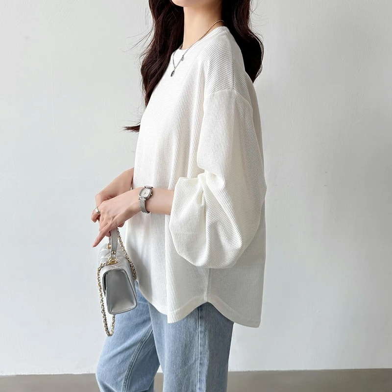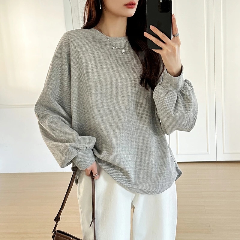 ラウンドヘムワッフルカットソー ボリューム袖 ロンT オーバーサイズ ボリューム袖 ワッフル カットソー 長袖 レディース ゆったり tシャツ トップス ドロップショルダー クルーネック