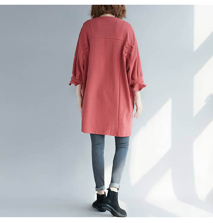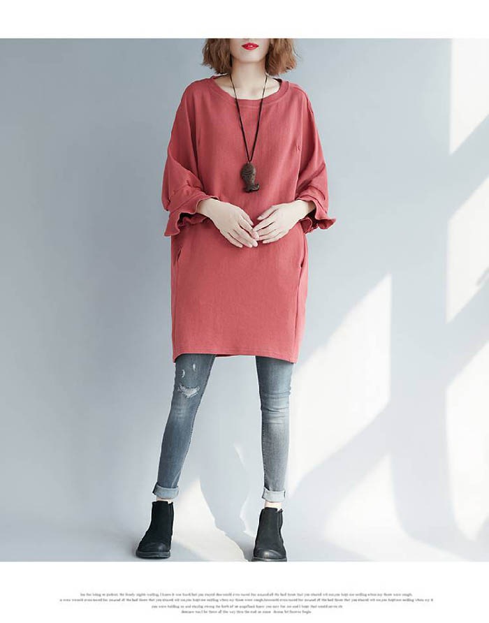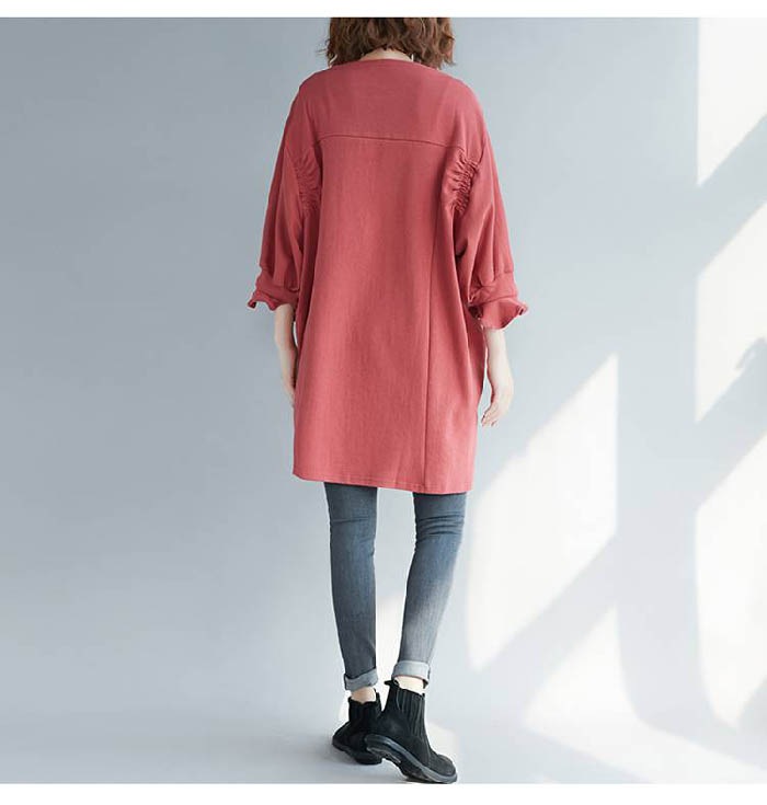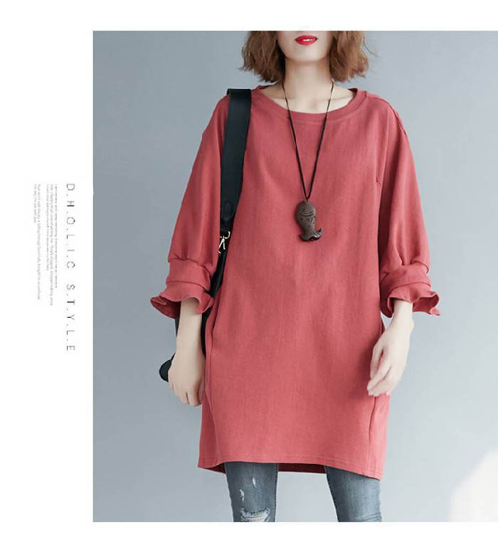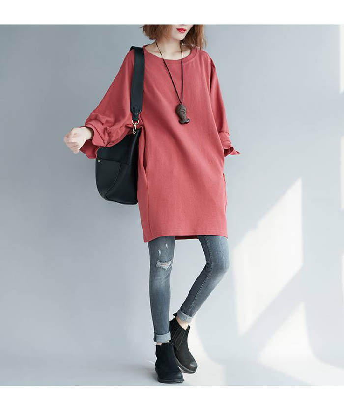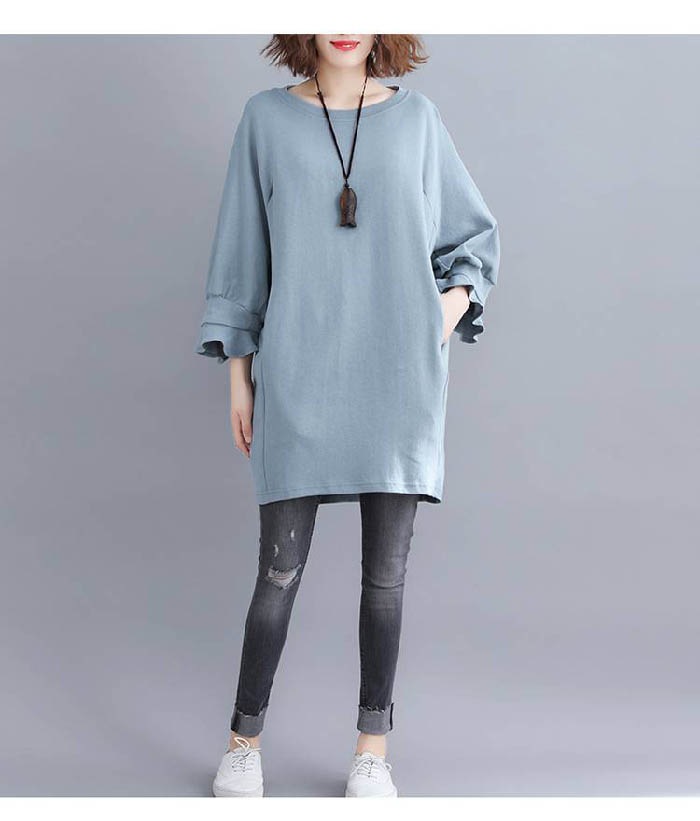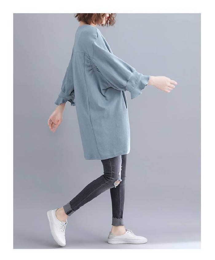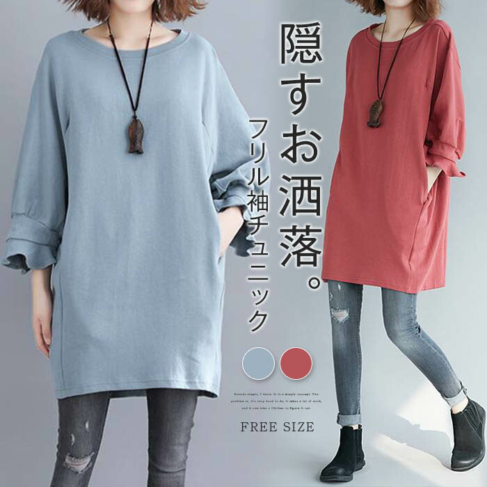 チュニック レディース 春 秋 フレア袖 フリル袖 大きいサイズ トレーナー 7分袖 ゆったり Tシャツ ロンT ブラウス オシャレ カジュアル ウエストギャザー 着回し 体型カバー ゆったり ゆるっ