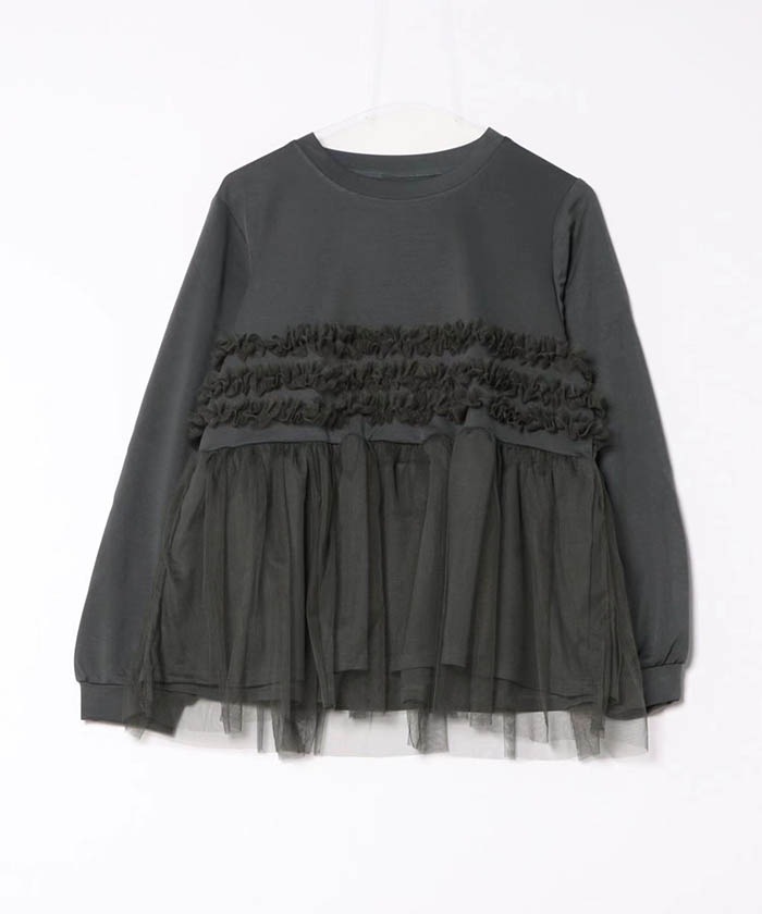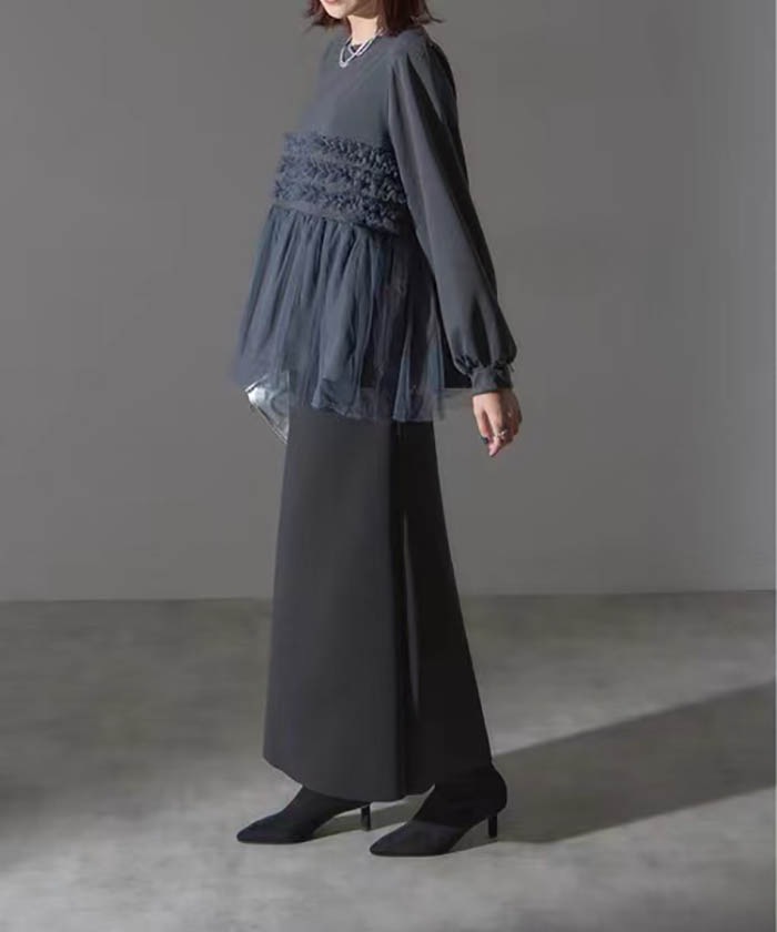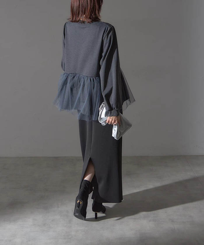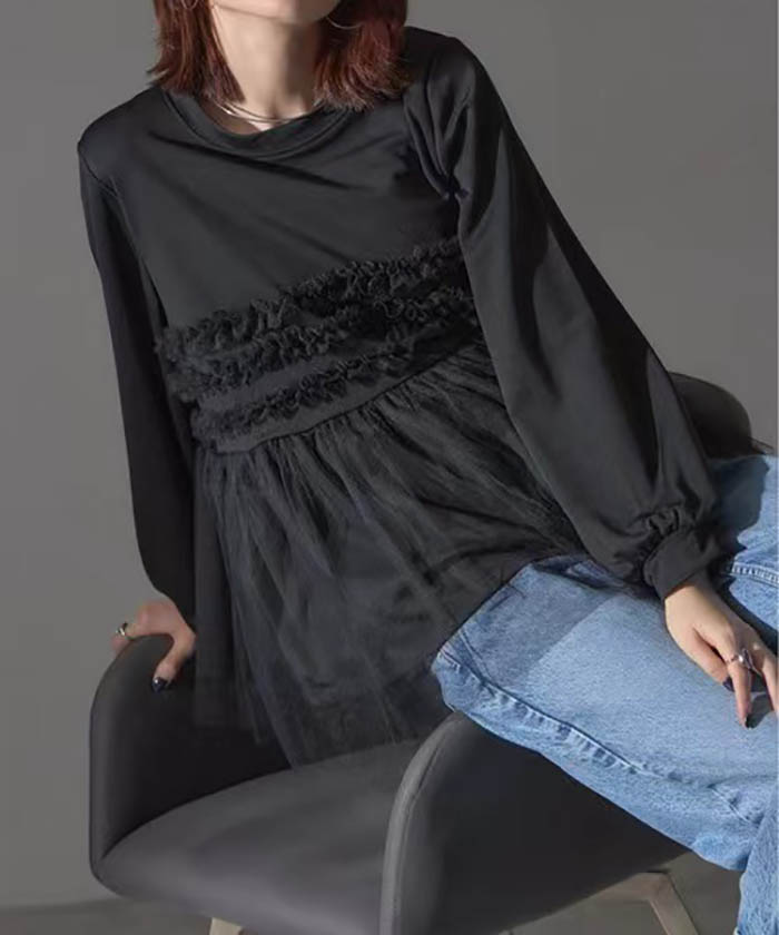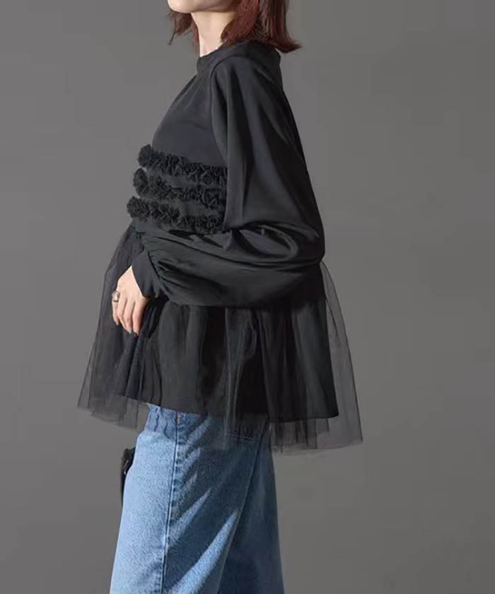セーター レディース チュール セーター 長袖 秋 春 冬 カレッジ ニット チュール切り替え カットソー チュニック ゆったり 重ね着 レイヤード風 チュールニット 体型カバー シンプル カジュア