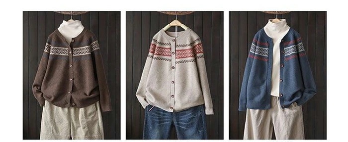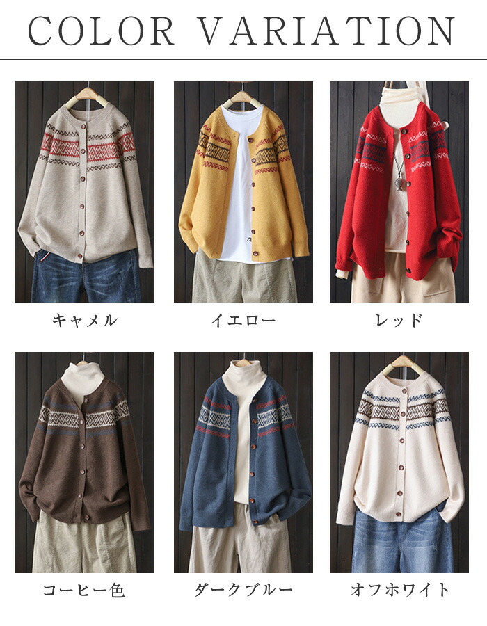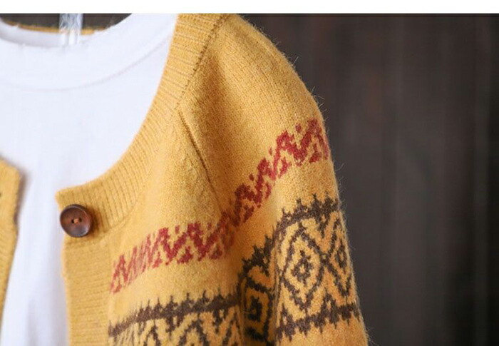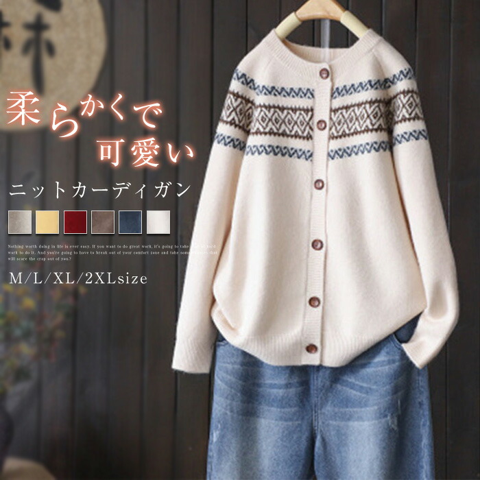 ニットカーディガン レディース 長袖 クルーネック 柄 ニットカーデ カーディガン ゆるカーディガン ニットカーデ 羽織り 春秋 大人カジュアル 大人可愛い 無地 前開き ゆったり エスニック レトロ
