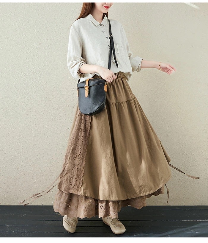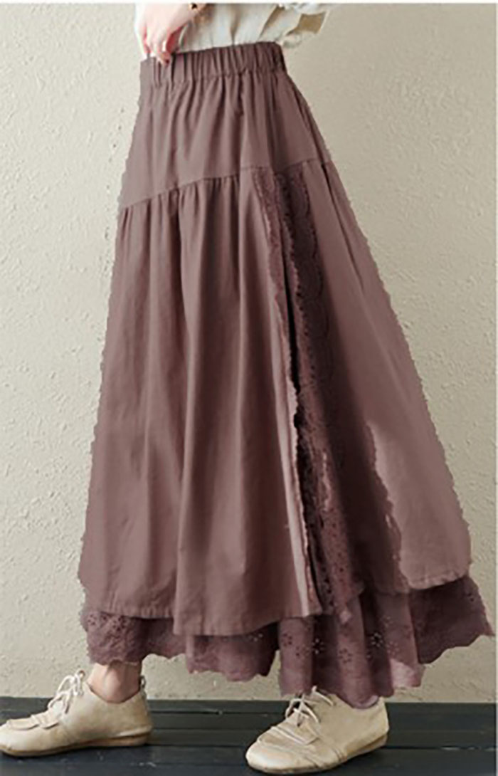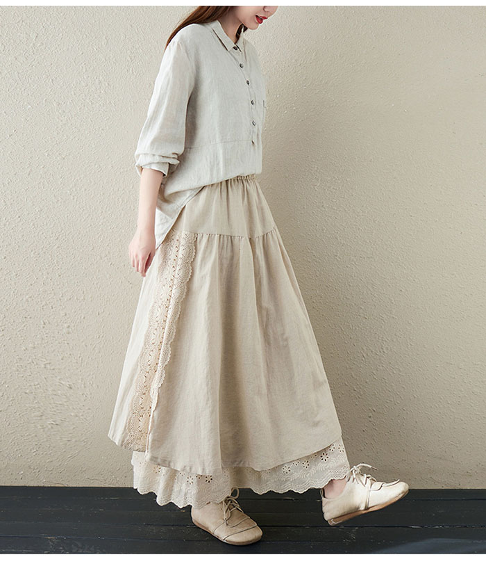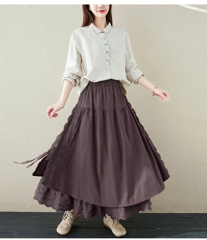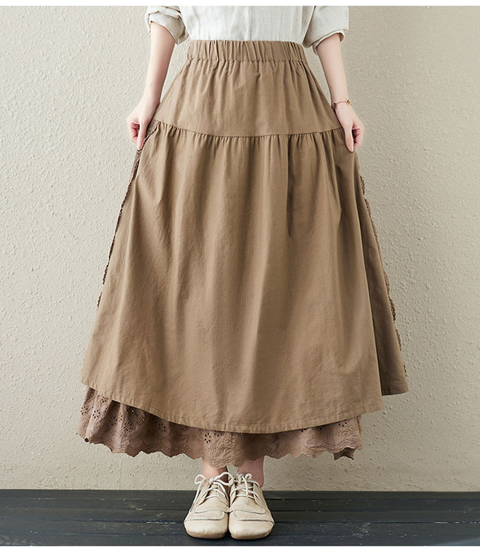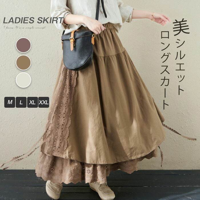 スカート ロング 春 Aライ 異素材 切替 レース アシンメトリー レディース ボトムス フレアスカート ロングスカート 大きいサイズ ゆったり ミモレ丈 ウエストゴム お洒落無地 ゆったり カジ