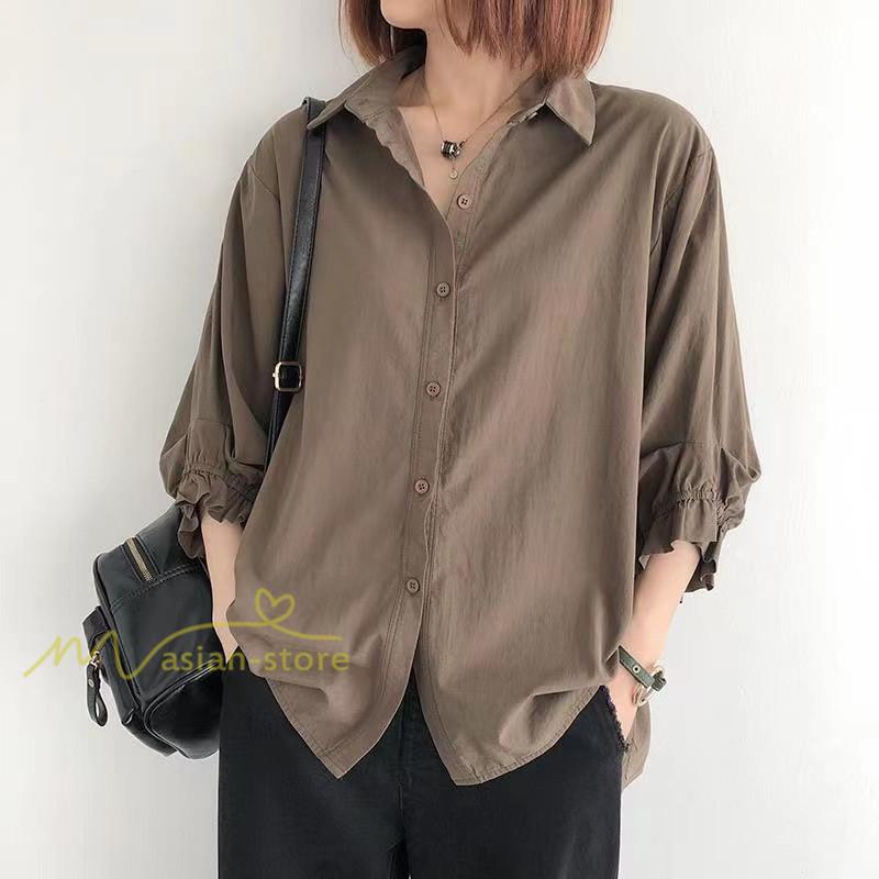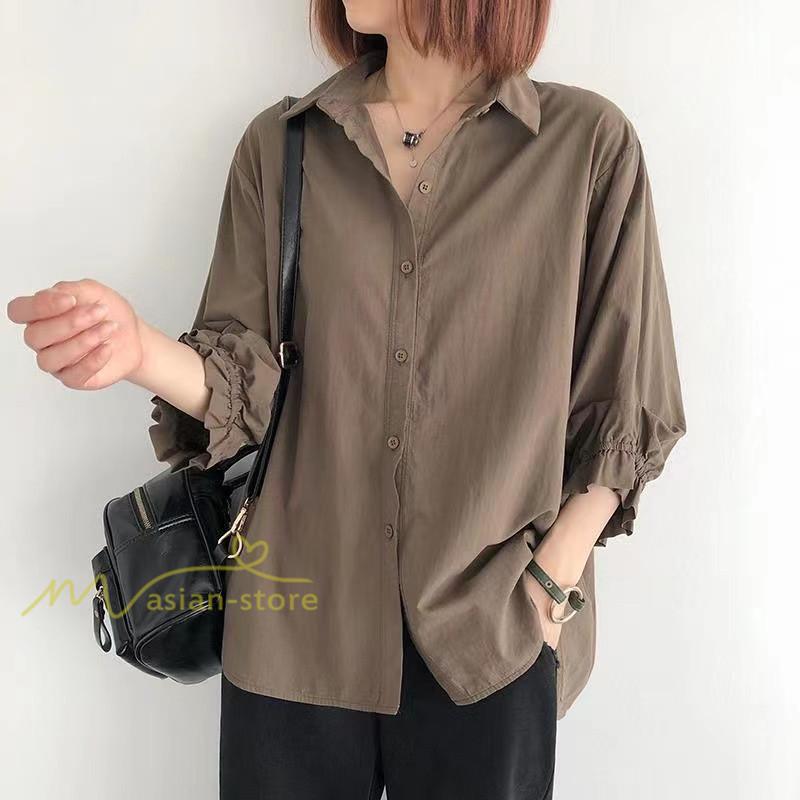 シャツ レディース 七分袖 開襟シャツ 夏物 トップス ボタン 無地 30代40代50代 vネック 前後差 チュニック丈 ワイド 可愛い ギャザー袖口 裾ラウンド