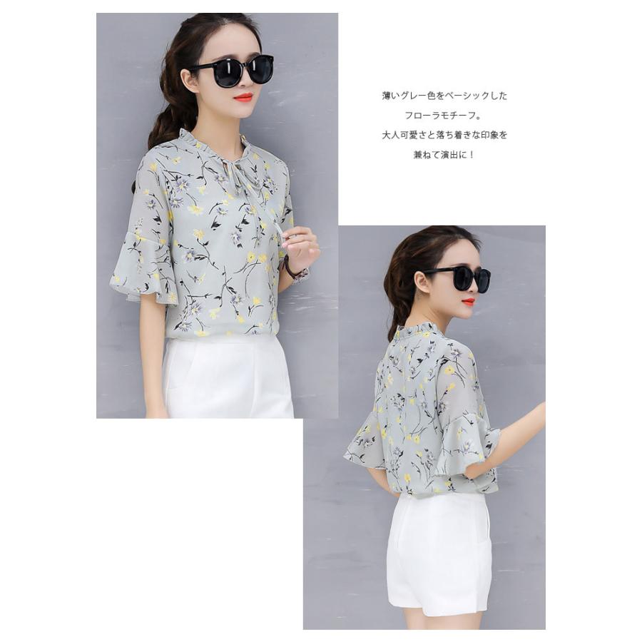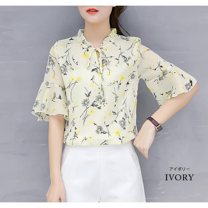 ブラウス レディース 春夏 黒 花柄 シフォン アイボリー グレー ブラック 大人 カジュアル シャツ トップス 半袖 チュニック 20代 30代 40代