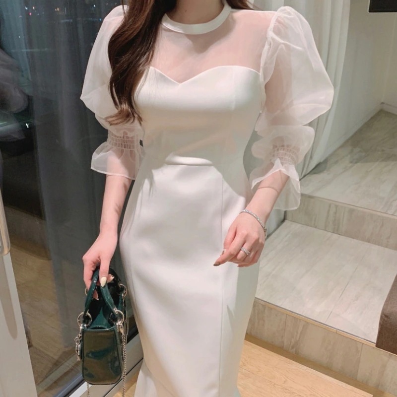 便利 2wayシフォンワンピース 気質 OL 通勤 ワンピースレディース 丸ネック メッシュ バブル袖 ワンピース シャツワンピ