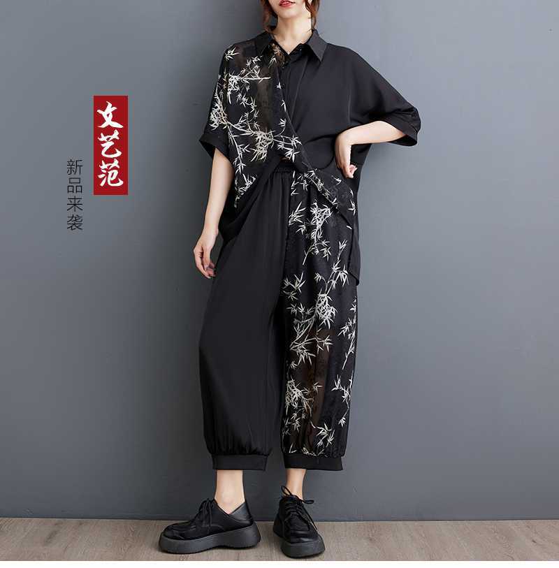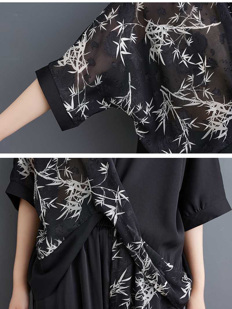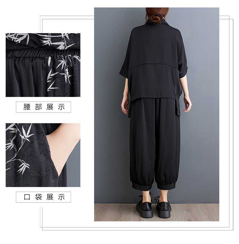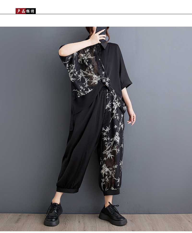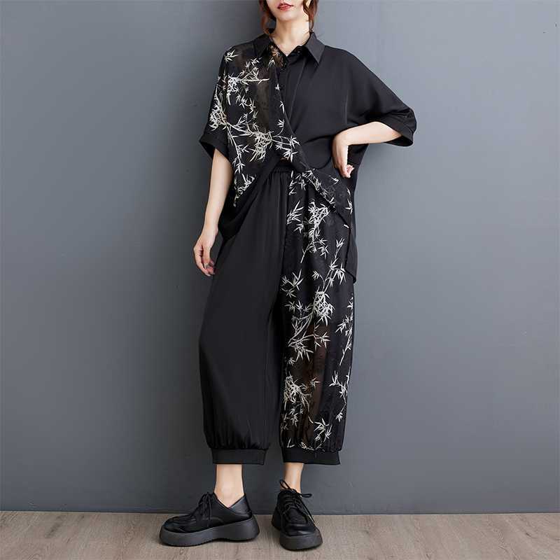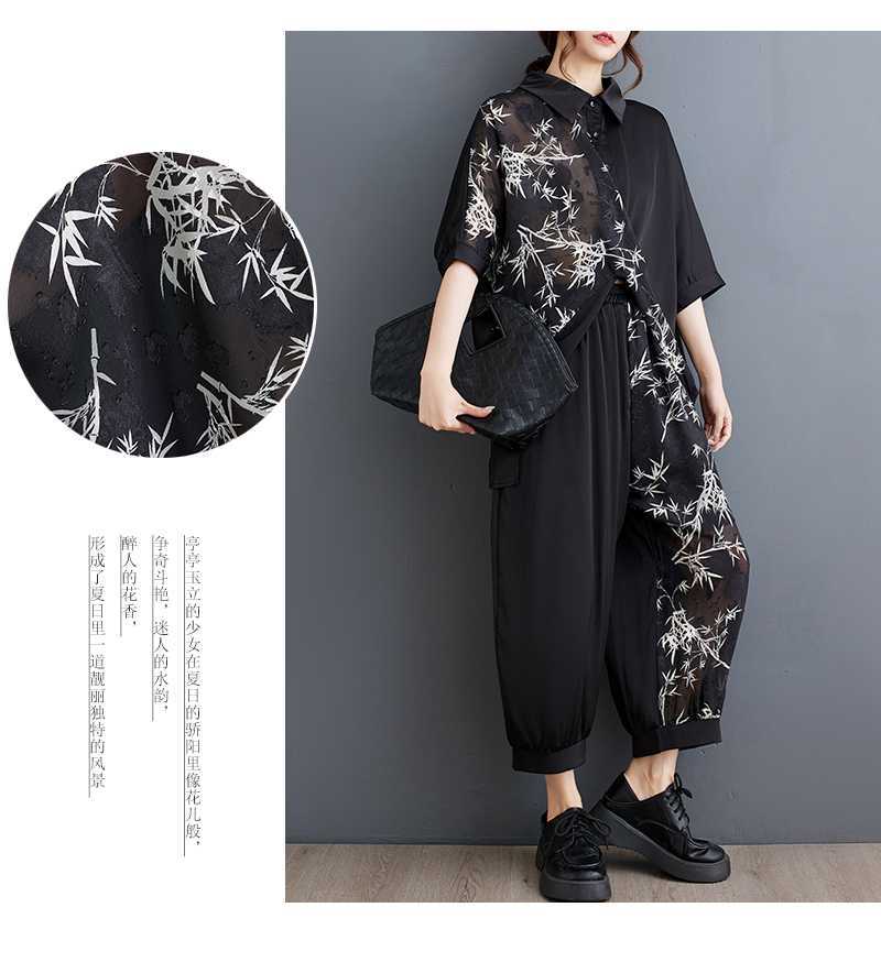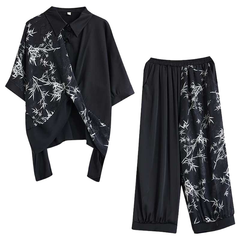 2025夏新品 上下セット 竹柄 七分袖ブラウス+九分丈ワイドパンツ 大きいサイズ 体型カバー レディース セットアップ メガ割