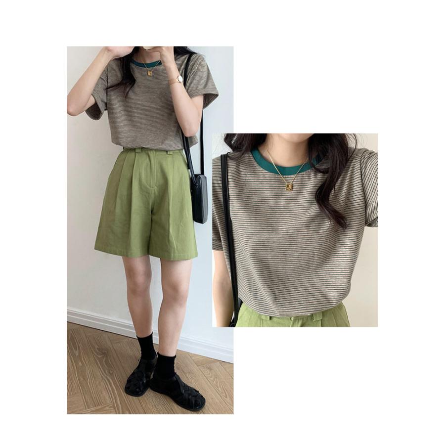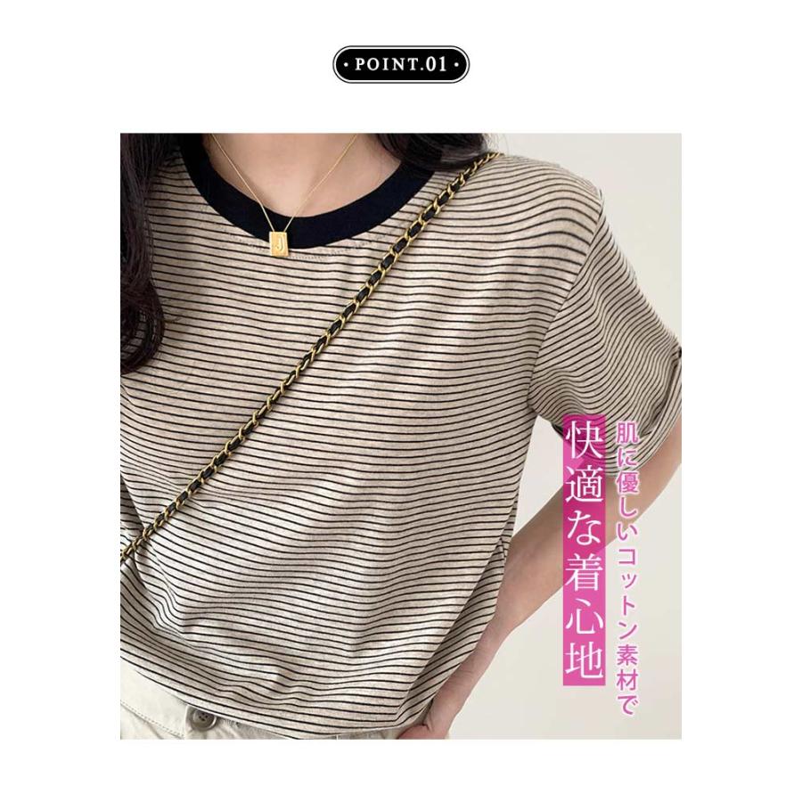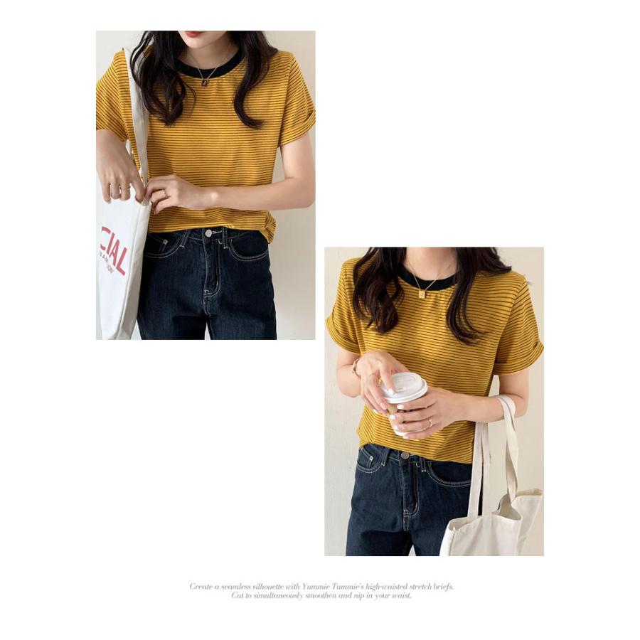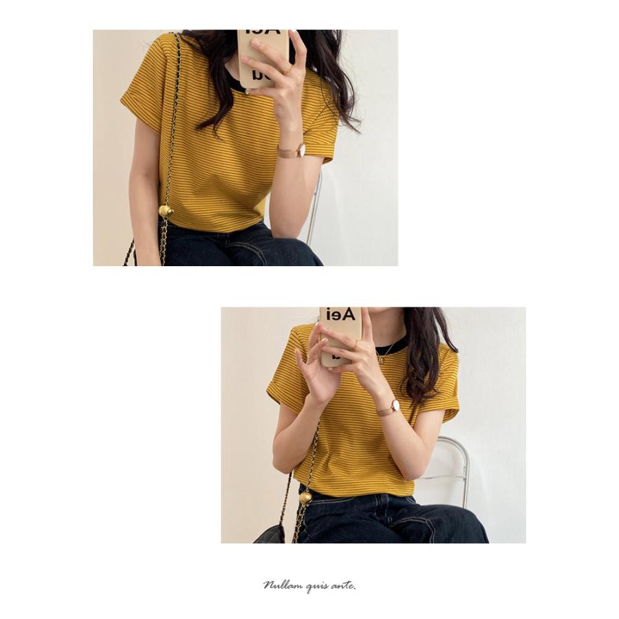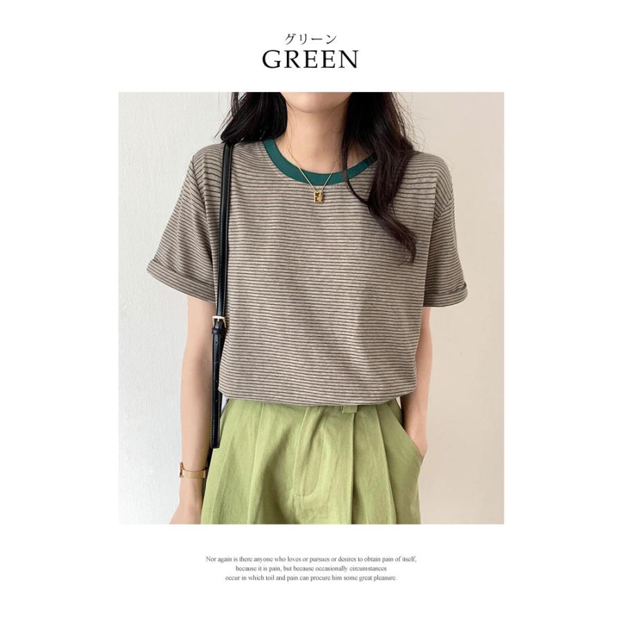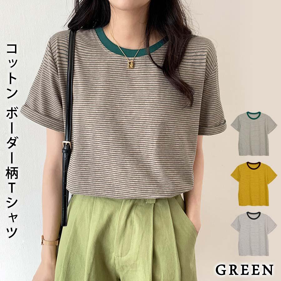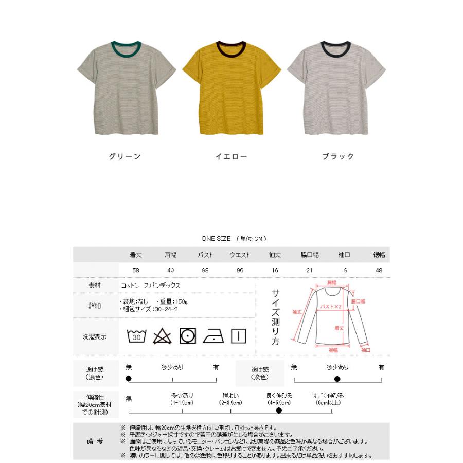 Tシャツ レディース 春 夏 春夏 黒 ボーダー 半袖 トップス ボーダー イエロー ブラック ストレッチ 半袖Tシャツ Uネック グリーン 20代 30代