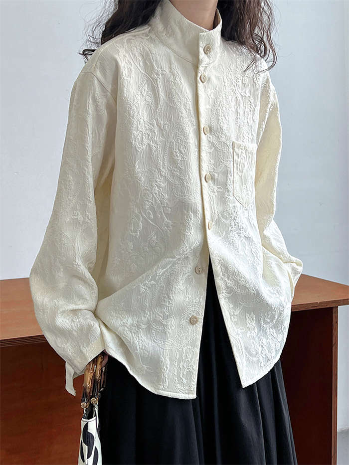 シャツ レディース ブラウン ジャケット 長袖 立体 花柄 シャツ 春 秋 夏 トップス 羽織り 前開き スタンドカラー チャイナシャツ チュニック チャイナ風 中華 前後差 フェミニン ゆったり カ