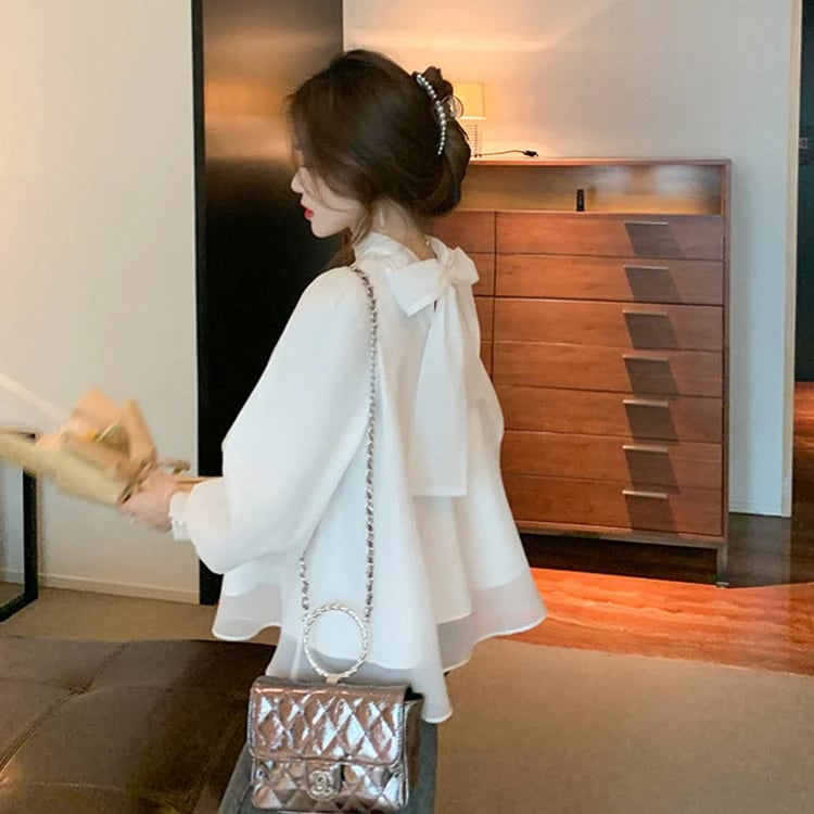 レディースパフスリーブボウタイブラウスAラインスタンドカラーブラウス長袖大人可愛いハイネックMボリューム袖Lトップス体型カバーゆったり春おしゃれ無地SホワイトフレアXL白バックリボン
