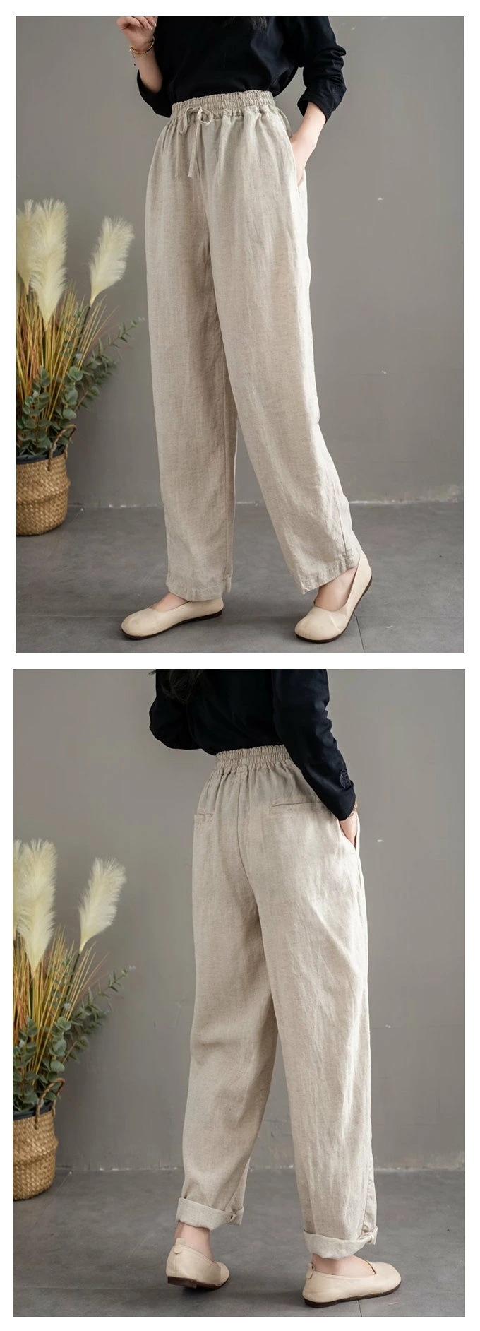 リネン100% リネンパンツ 麻パンツ レディース 春 夏 秋 涼感 テーパードパンツ 裏パイピング 春パンツ 秋パンツ 10分丈 シャリ感 ウエストゴム 4ポケット 麻色 エクリュ生成