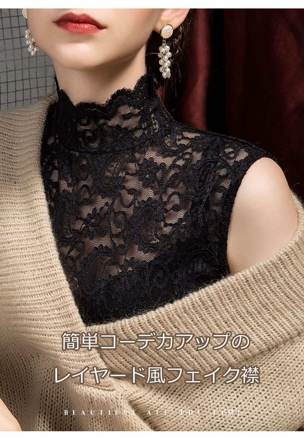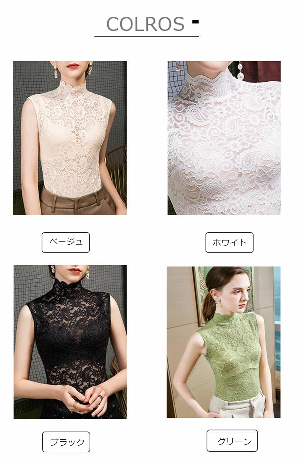 つけ襟 付け襟 レディース フェイク襟 総レース レイヤード風 タンクトップ トップス ハイネック タンクトップ 彫り 透けノースリーブ 重ね着 着回し 体系カバー インナー Tシャツ 薄手 レディー