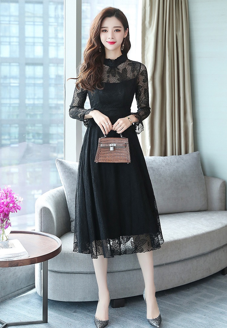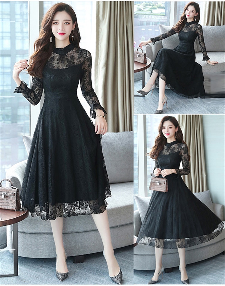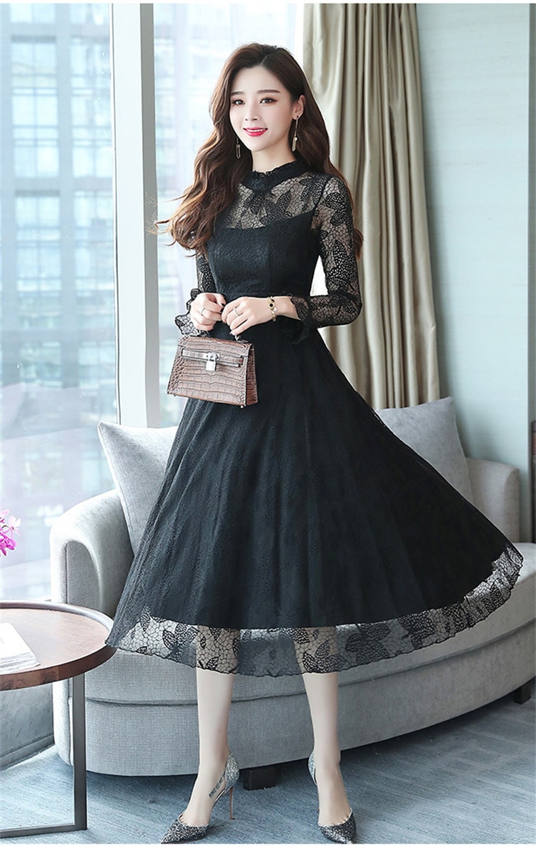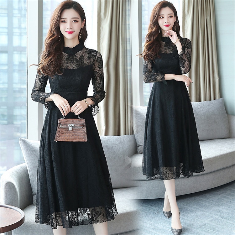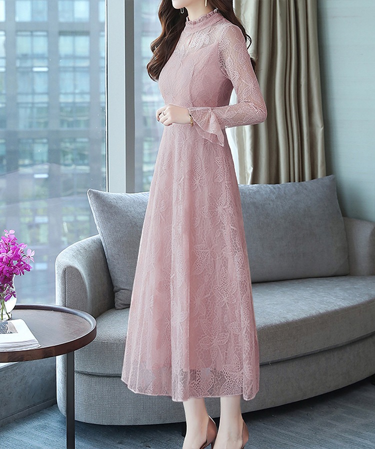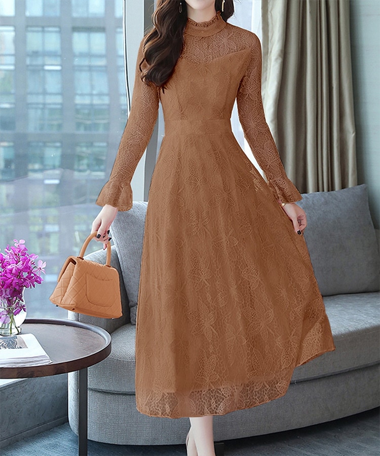 ワンピース レディース レース ロング フリル ドレス 長袖 フレア 総柄 可愛い ハイウエスト 着痩せ おしゃれ シアー きれい 裏地付き パーティー 結婚式 通勤 二次会