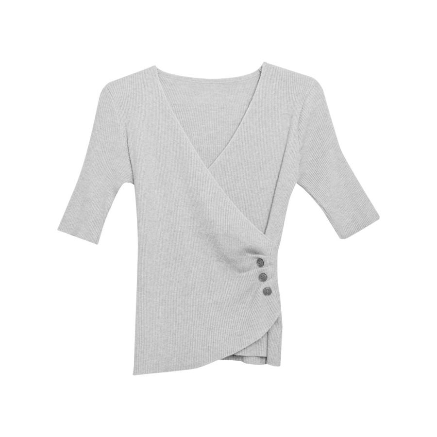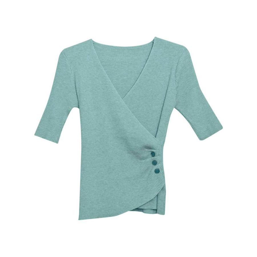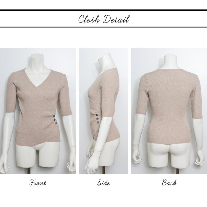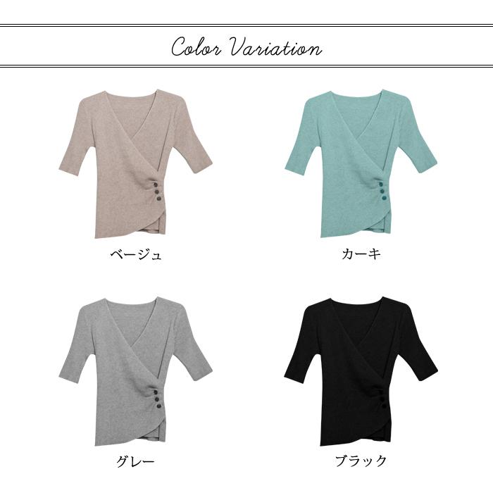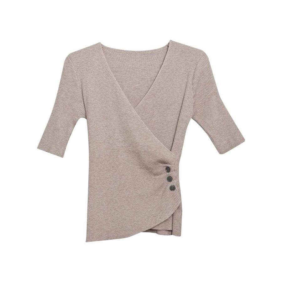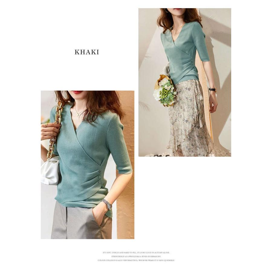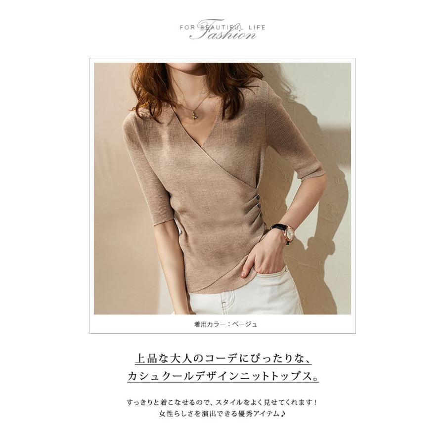 トップス レディース 春 ニット 無地 チュニック Vネック 5分袖 20代 30代 40代 ベージュ カーキ グレー ブラック ベーシック 大人 タイト