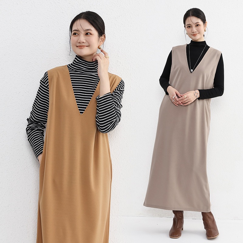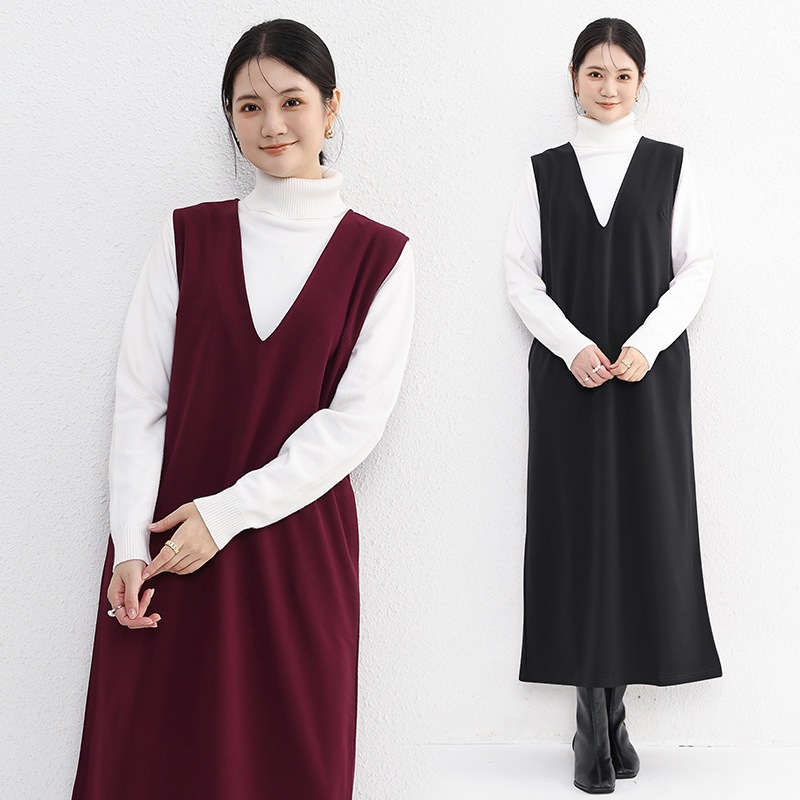 レディースファッション ノースリーブ Vネック ワンピース ドレープ感 膝丈 ベストドレス スリット付き ロングドレス レディース用 袖なしミニ 膝丈ワンピ