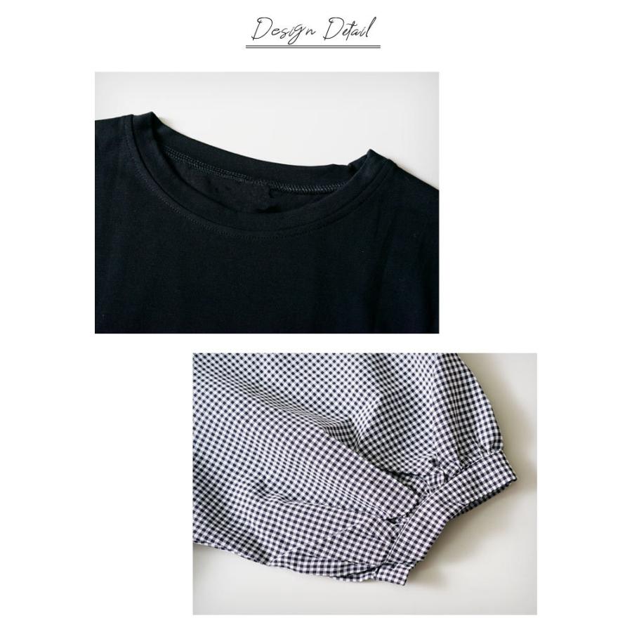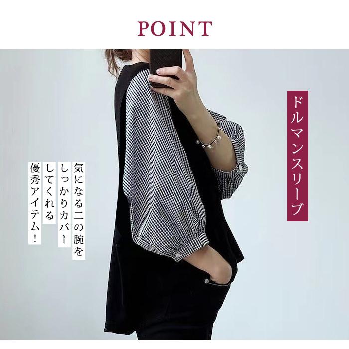 ブラウス レディース 春 夏 春夏 黒 シャツ ドッキング 5分袖 グレー ブラック チェック ドルマン トップス 半袖 チュニック 無地 20代 30代 40代