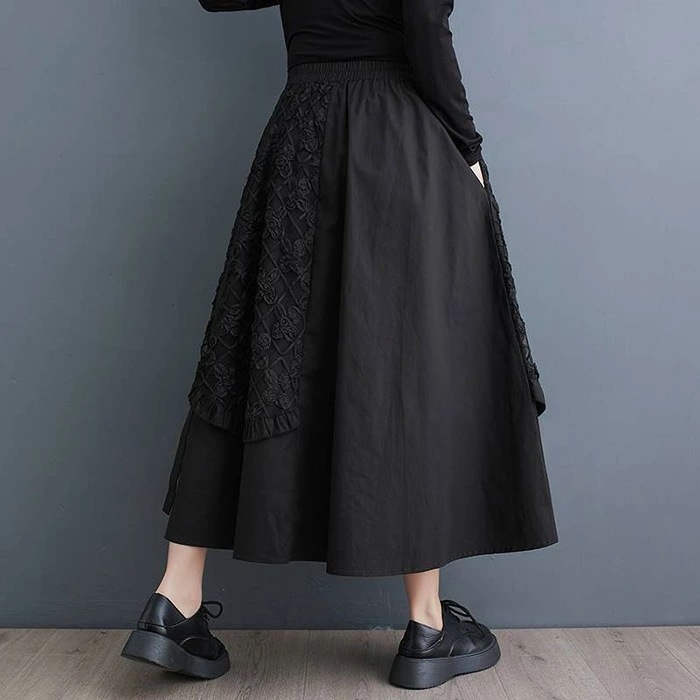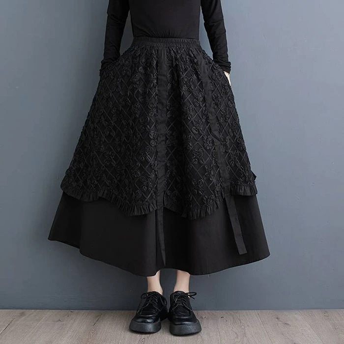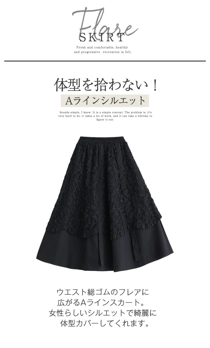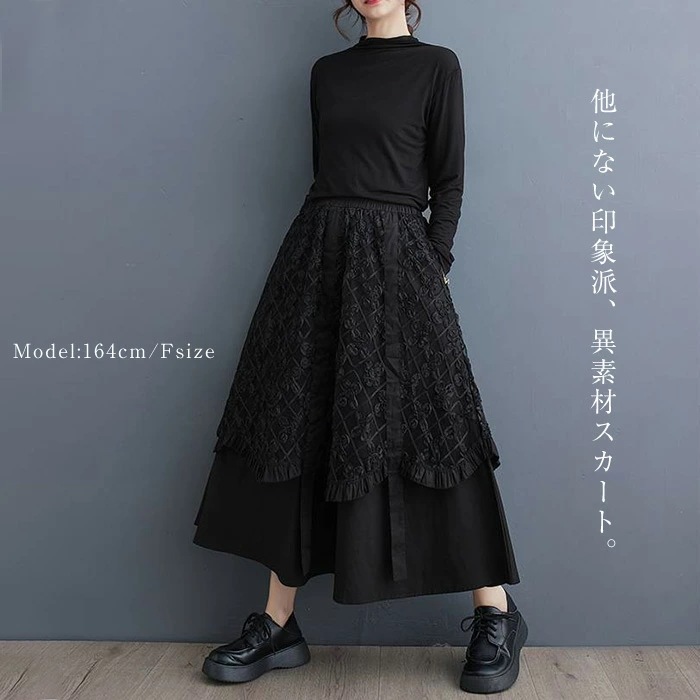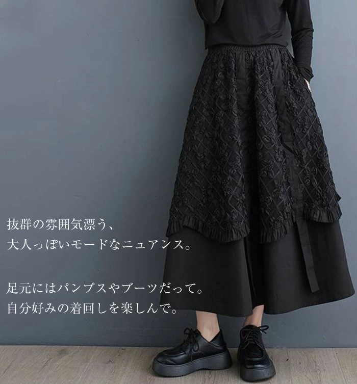 スカート 秋冬 フレアスカート ロング丈 ロングスカート 大きいサイズ ボトムス ボリューム 体型カバー ロング ミモレ丈 Aライン フレア ウエストゴム ゴム レディース 黒 ブラック 無地 カジュ