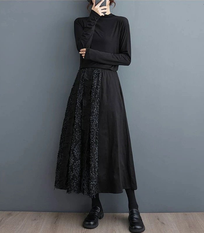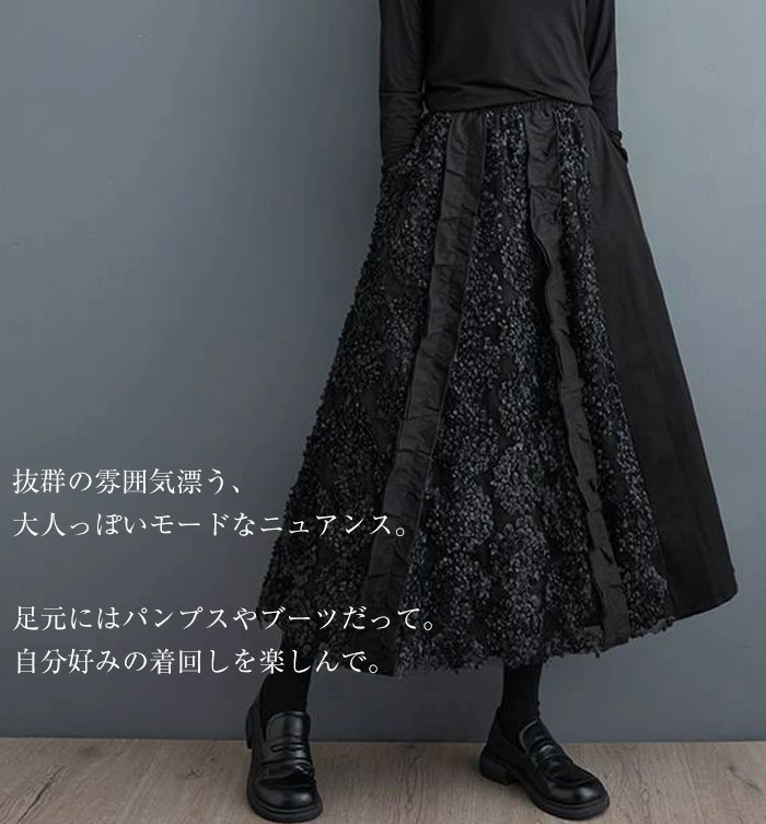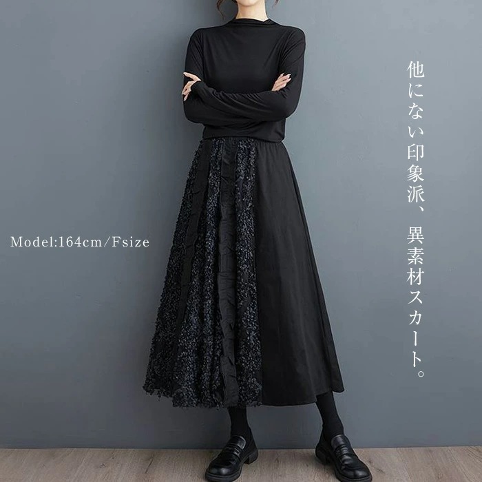 スカート ロング丈 異素材切替え ロングスカート 秋 冬 フレアスカート 大きいサイズ ボトムス 体型カバー ロング ミモレ丈 Aライン フレア ウエストゴム ゴム レディース カジュアル エレガント