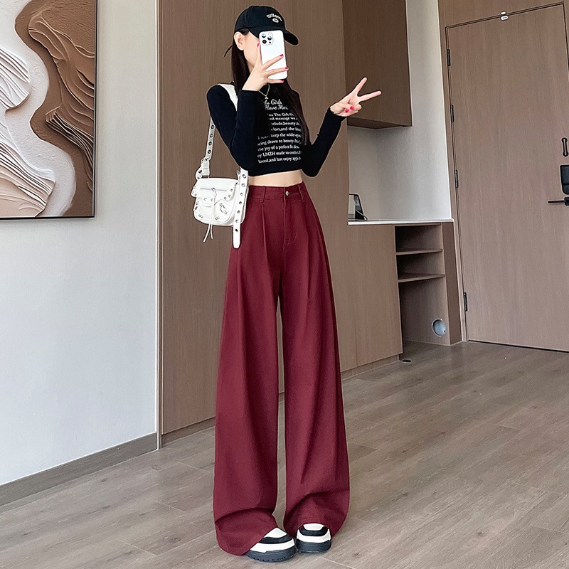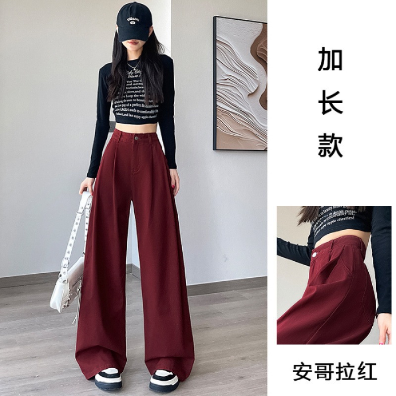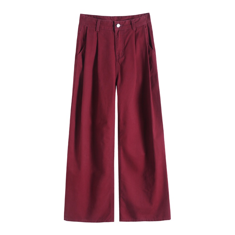 アメリカのレトロな赤いジーンズ女性秋の新型ハイウエストは股を覆って痩せたしわのデザイン感があるストレートパンツ ロングパンツ