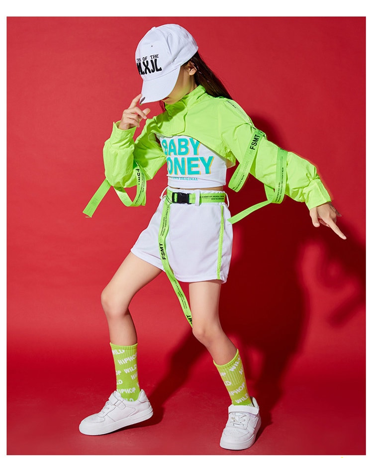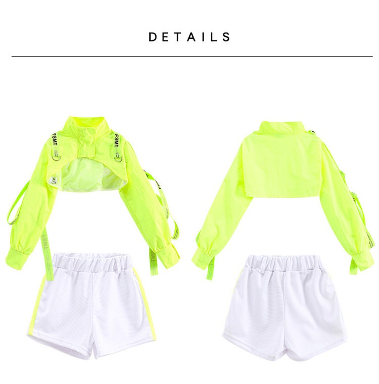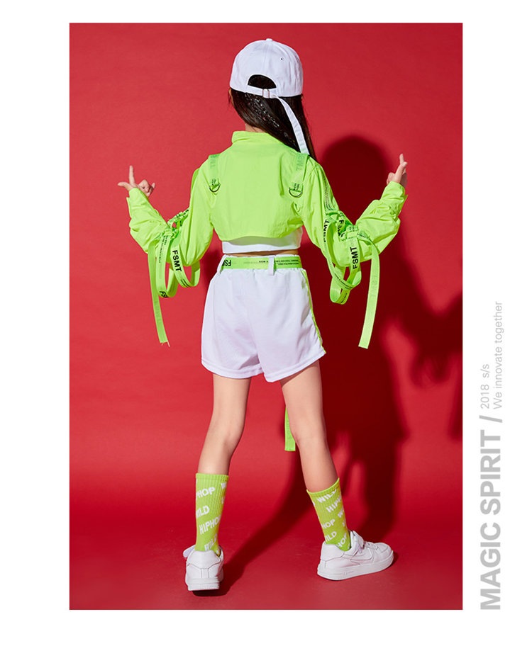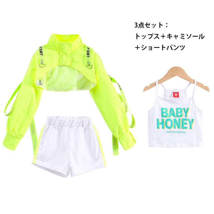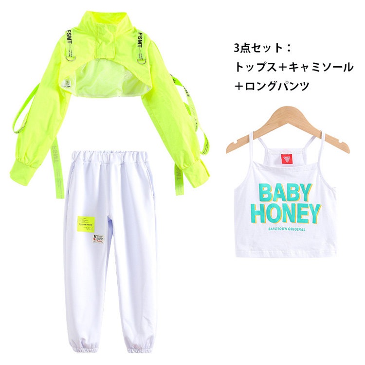 蛍光緑 トップス 女の子 ダンス 衣装 セットアップ 白パンツ ガールズ ジャズ hiphop ヒップホップ 韓国 k-pop ステージ 演出服 舞台 発表会 おしゃれ 上下セット 110-180cm