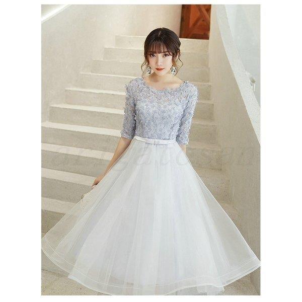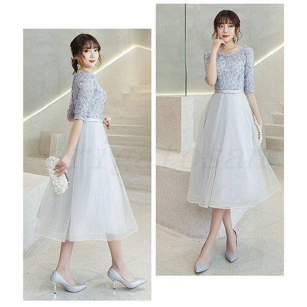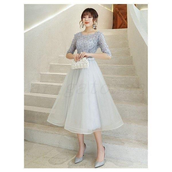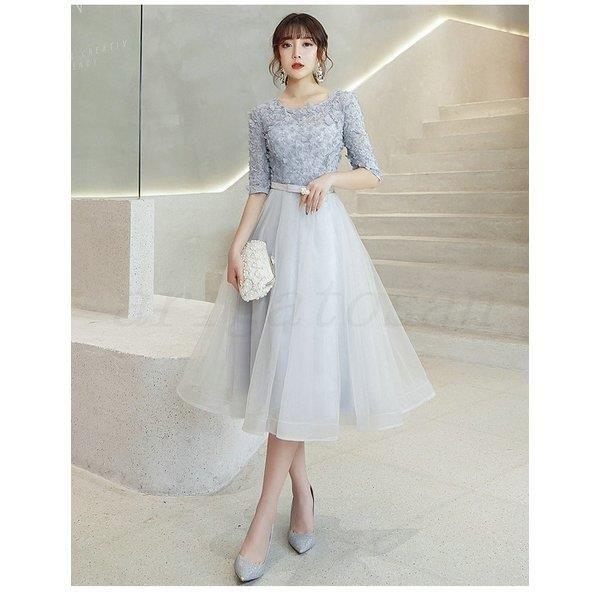 パーティードレスミモレ丈結婚式ワンピースフォーマルドレスグレー結婚式ドレス五分袖お呼ばれ服服大きいサイズ大人上品女性203040 ドレス