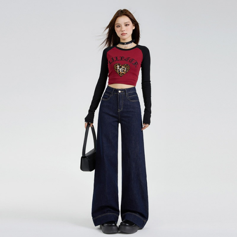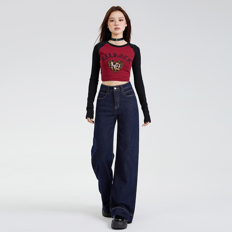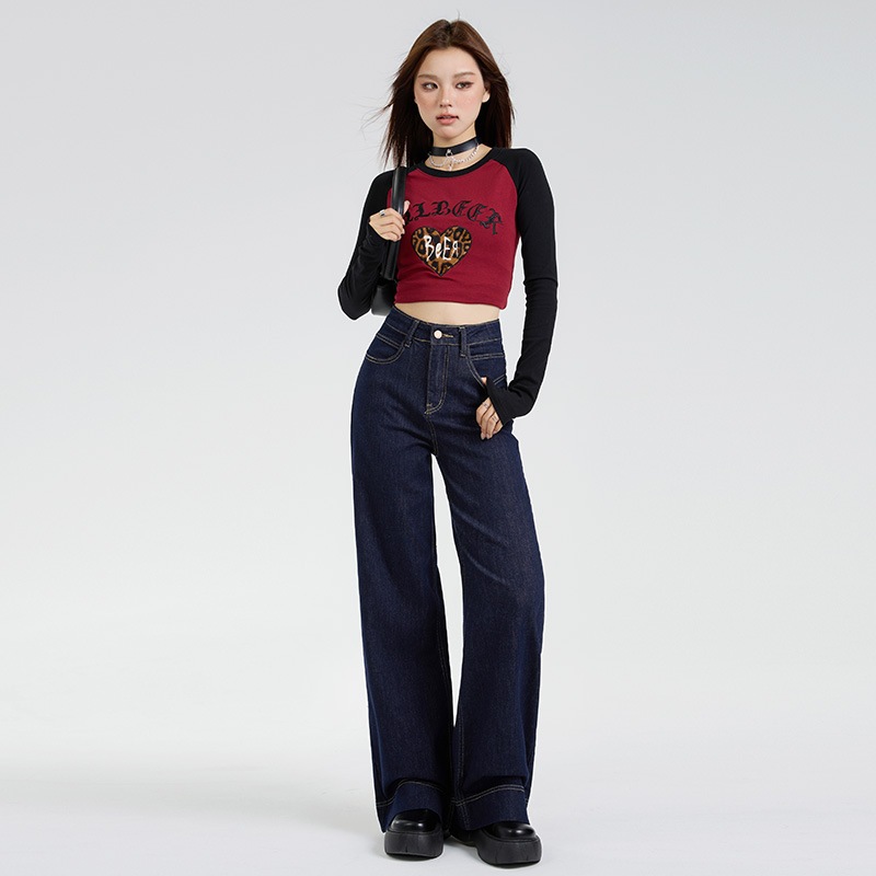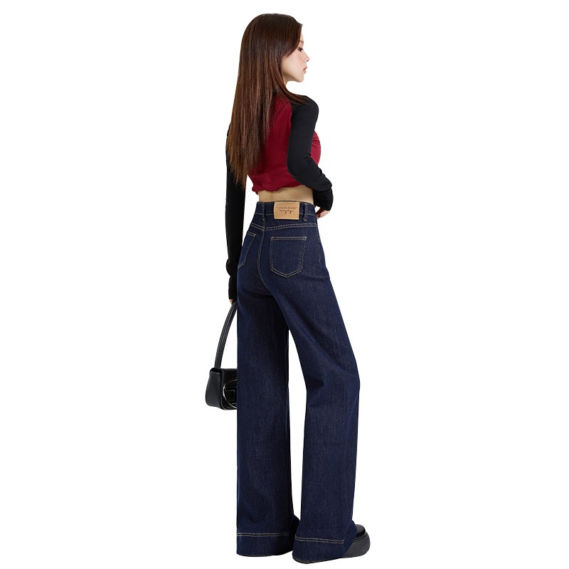 秋の新型高腰弾力ラッパズボンがゆったりとしていてジーンズの長ズボンが長くなっています ロングパンツ