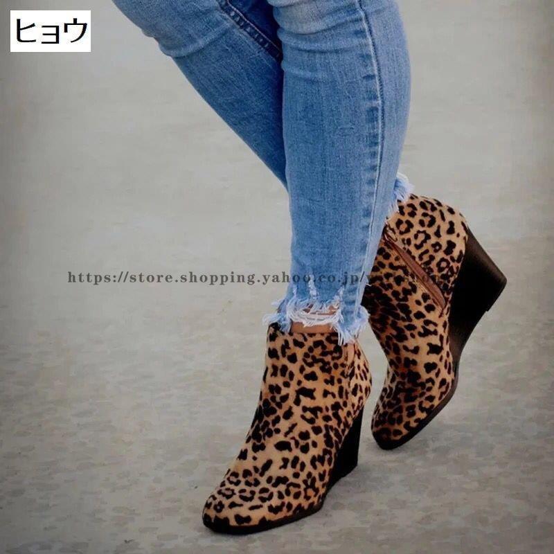 ショートブーツ ショート丈 レディース スエード調 ヒョウ柄 ウェッジヒール ウェッジソール スリット 無地 単色 ファスナー ジップアップ 婦人用