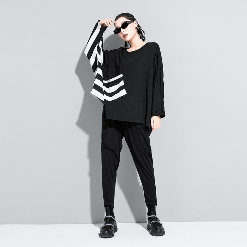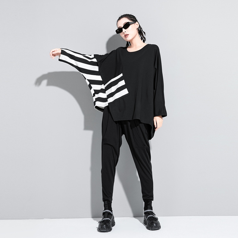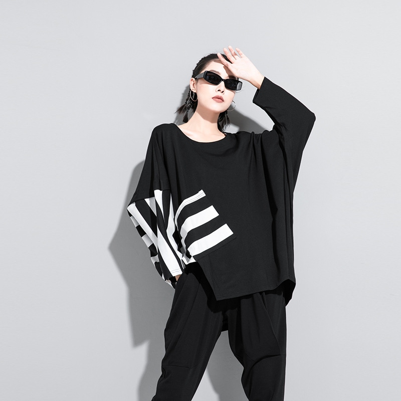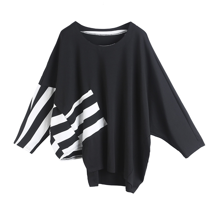 欧米大きいサイズ 暗黒系しま不規則な大きいサイズのコウモリの袖の長袖tシャツ着痩せ上着 Tシャツ カットソー
