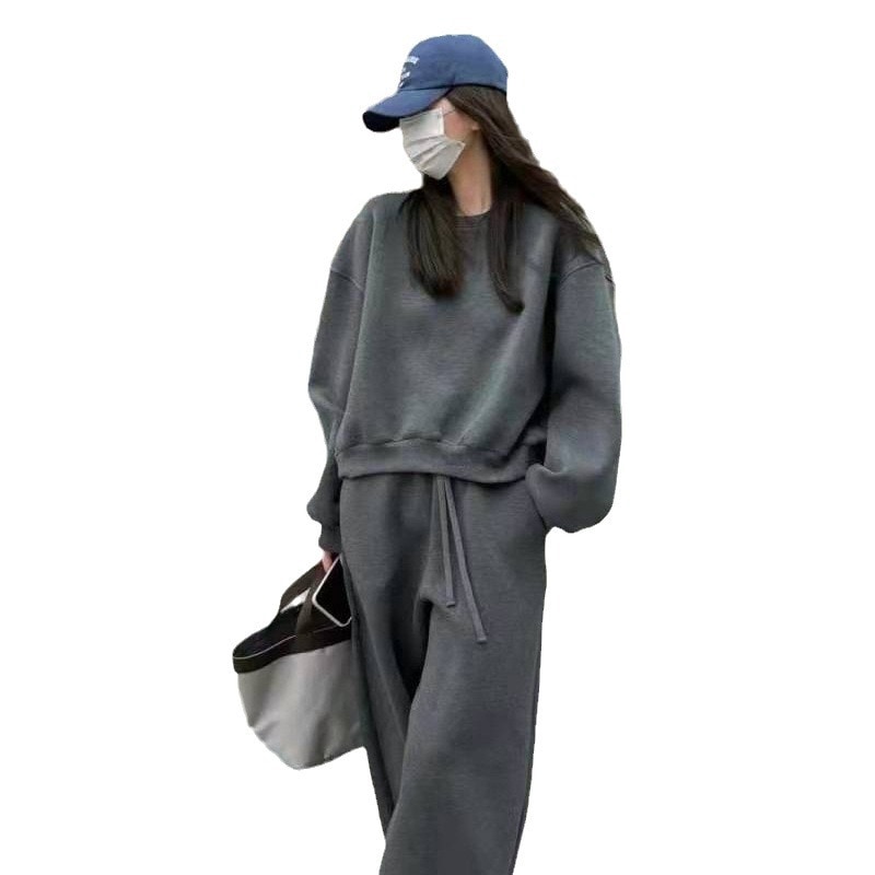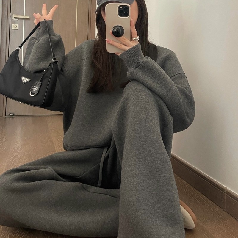 韓国ファッション レディース セットアップ 冬のセータースポーツスーツ女性緩い薄いランニング服無地ツーピーススーツ セットアップ