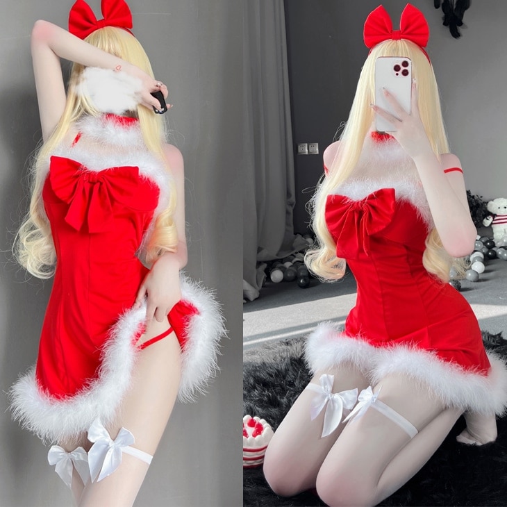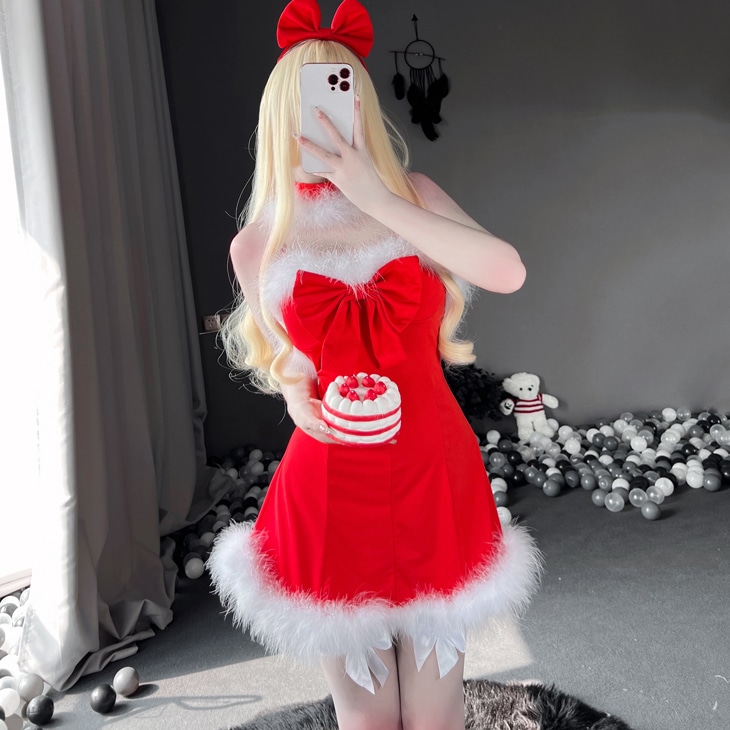 クリスマスコフレ サンタコスプレ ワンピースタイプ 背中開き ふわふわ ストッキングセット リボン レッド サンタコス コスチューム クリスマス 衣装 セクシー サンタクロース パーティ ミニスカ セ