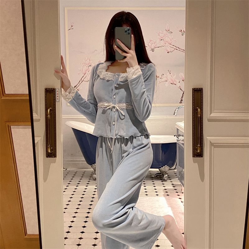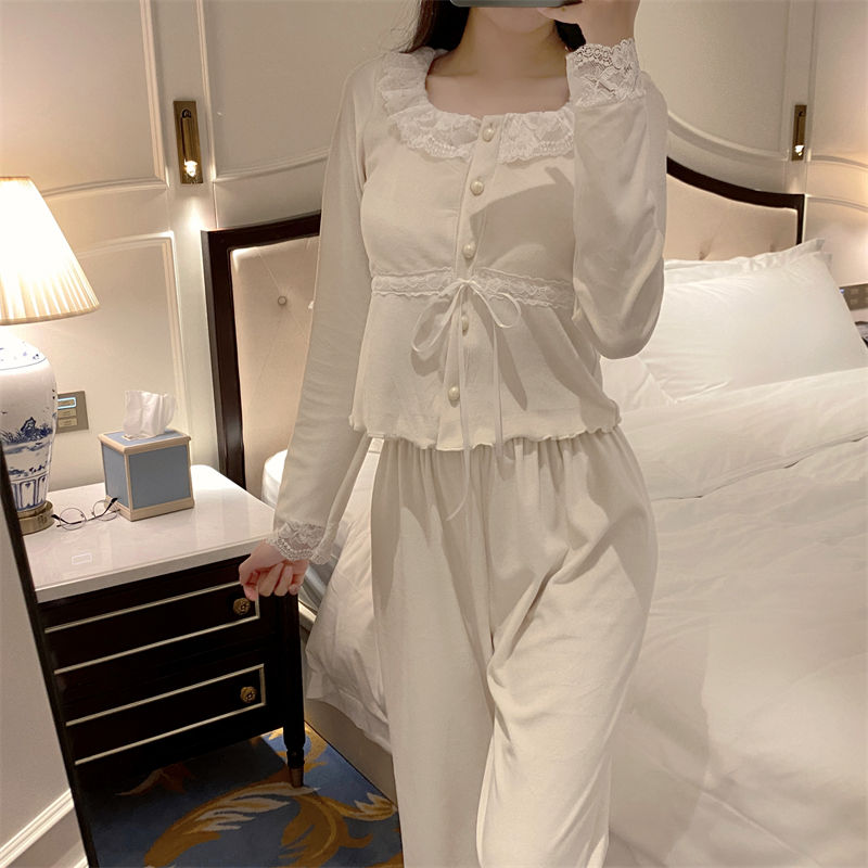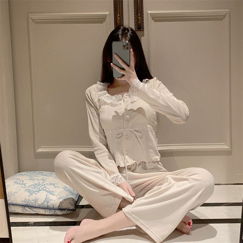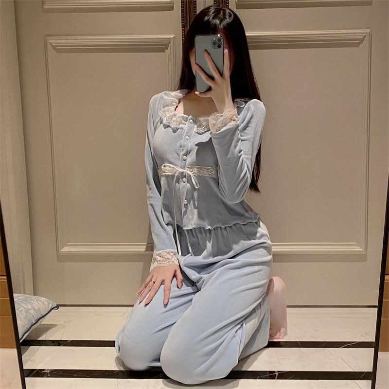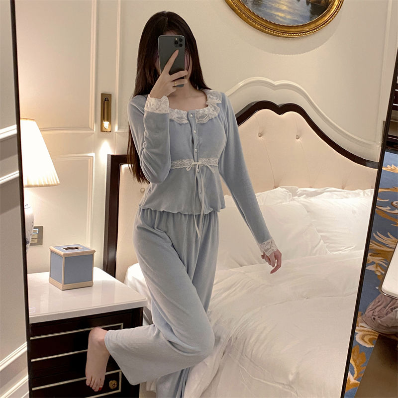 韓国ファッション パジャマ着 胸当て付き 秋冬 甘いレース長袖スーツ パジャマ