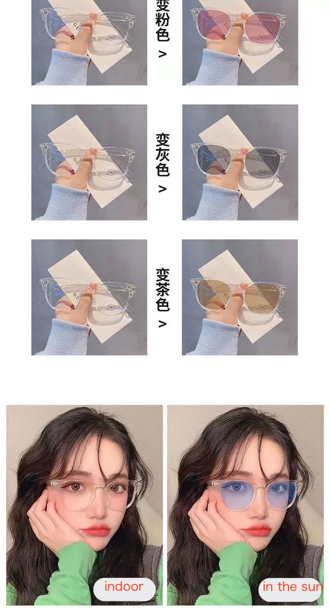 Color: 透明变色蓝 透明变色粉 透明变色灰 透明变色茶 亮黑变色蓝 亮黑变色粉 亮黑变色灰 亮黑变色茶 砂黑变色蓝 砂黑变色粉 砂黑变色灰 砂黑变色茶 黑色变灰 黑色变茶 黑框金腿变灰 黑框金腿变茶 黑框银腿变灰 黑框银腿变茶