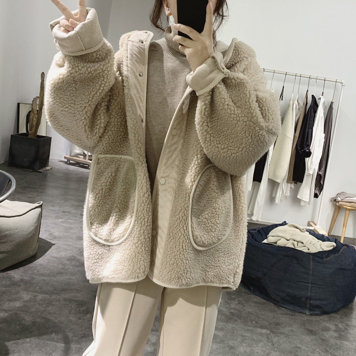 羊の毛のコートを両面に着た女春秋2024年新型韓国版ゆったり毛皮一体にスエードの厚手の上着 トレンチコート