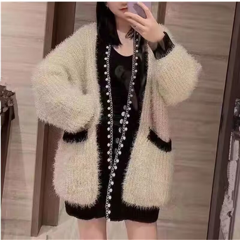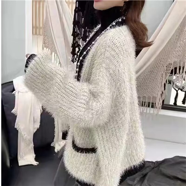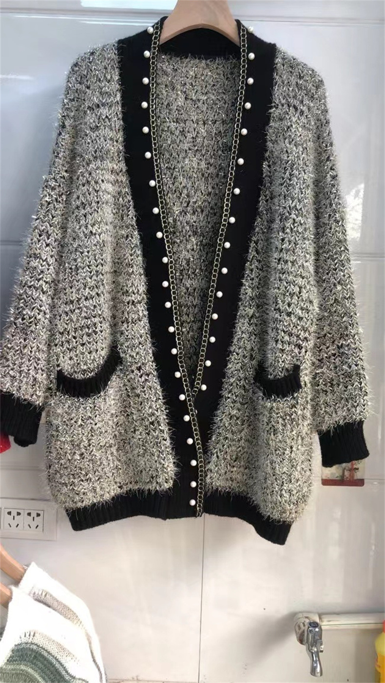 秋冬の新作重工釘珠亮糸毛むくじゃらミディアム丈婦人セーターニットカーディガンゆったりモチモチオーバーラッシュ カーディガン