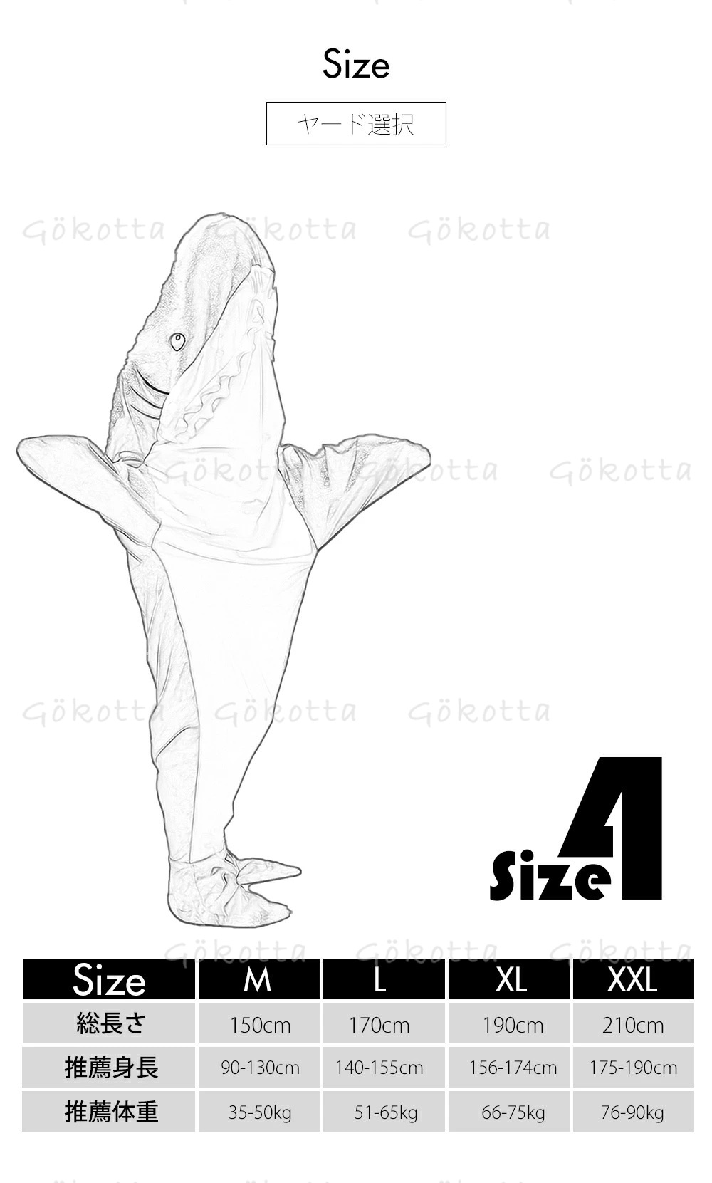 Size: M(適応身長150cm) L(適応身長170cm) XL(適応身長190cm) XXL(適応身長210cm)