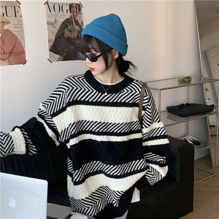 大きいサイズの春と秋の冬の新型の縞の韓国系の頭をかぶるセーター女性はゆったりとだるい外はやせて見えるニットのセーターの上着を着ます ニット