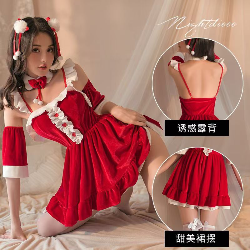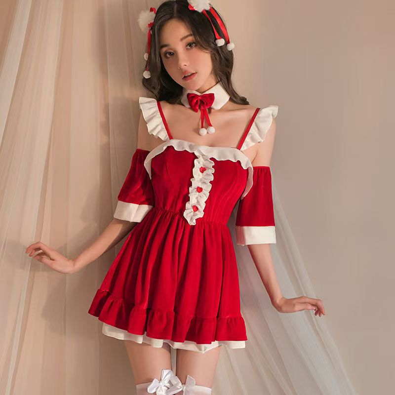 サンタコスプレ 2023新しいクリスマス制服かわいいメイド木耳レースリボンホーム誘惑ナイトガウン レディース 韓国 クリスマス