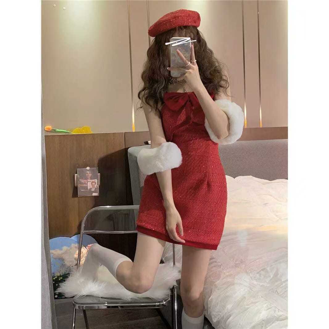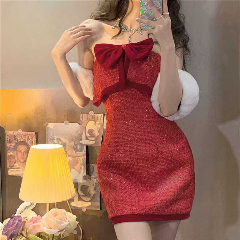 ハロウイン のスーツの洋気の齢を減らして純欲します風クリスマス新年王女風腰を直して赤い蝶の結び目のワンピース サンタコスプレ レディース クリスマス