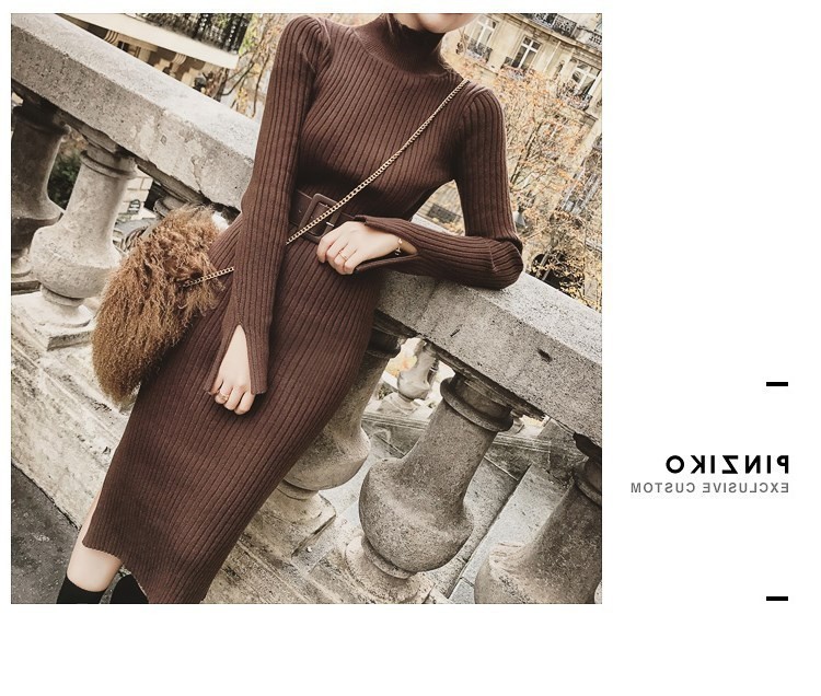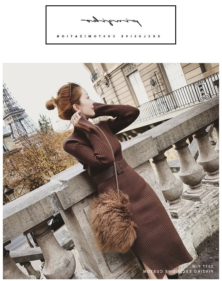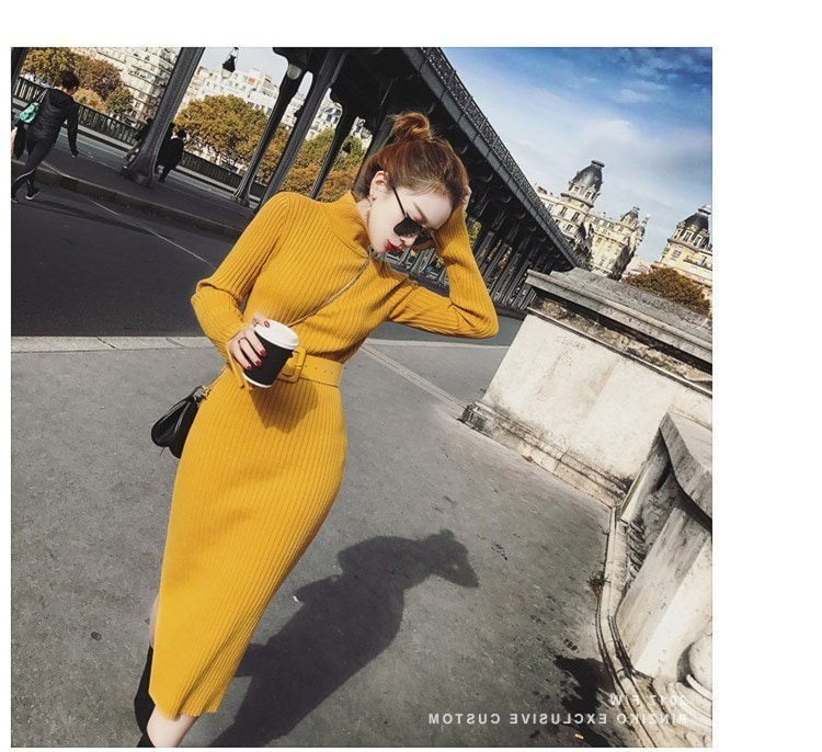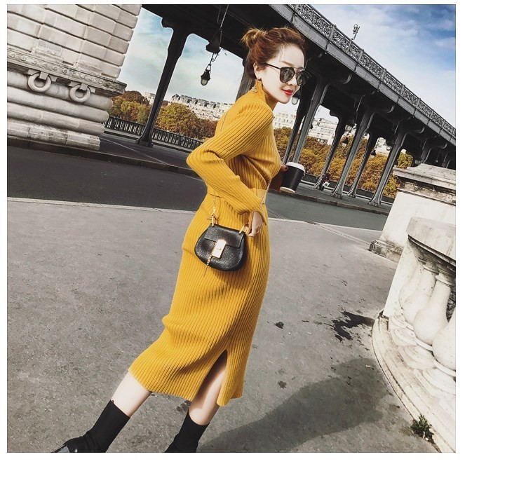 大人の魅力 ニットワンピースレディース長袖ベルト付き秋冬膝丈オフィスハイネック無地カシュクール体型カバープリーツワンピース上品着痩せ ニットワンピ