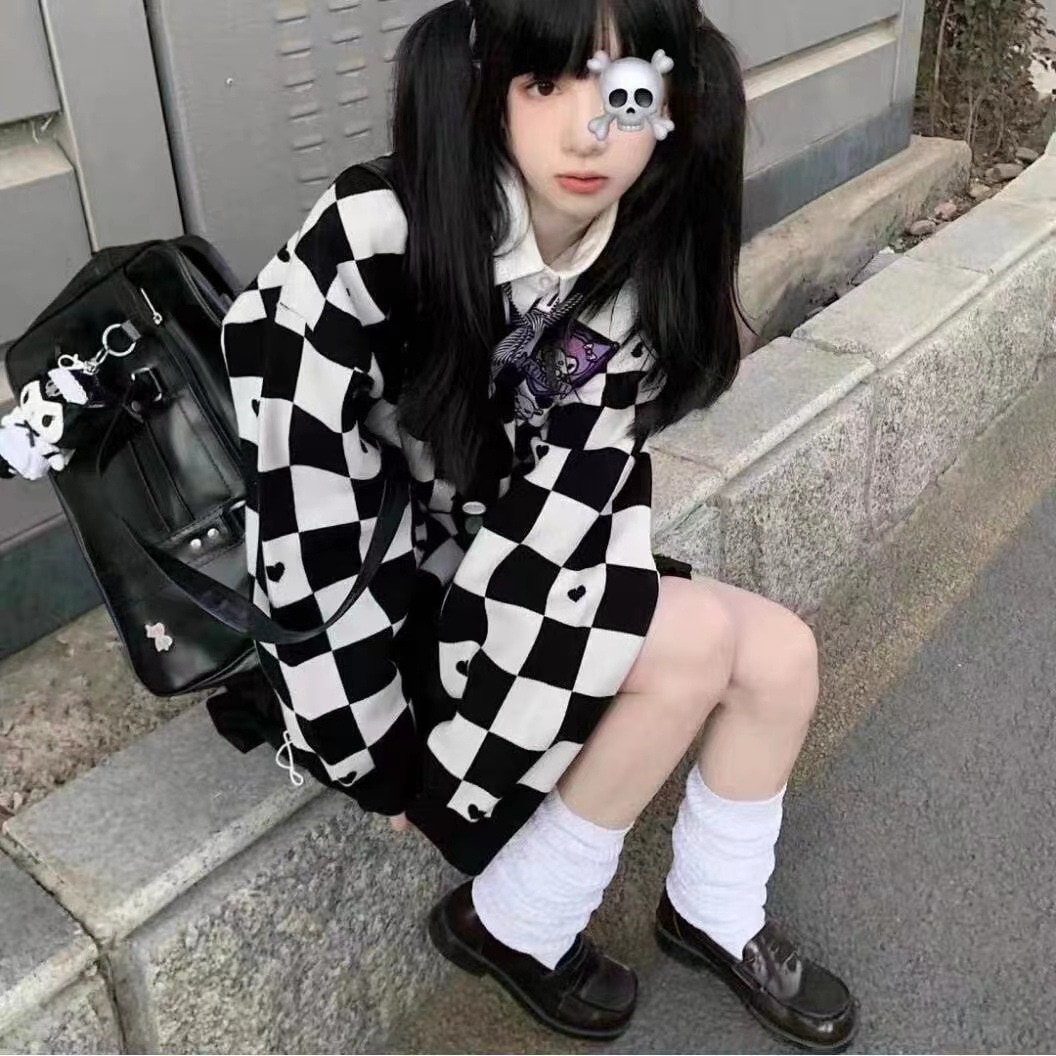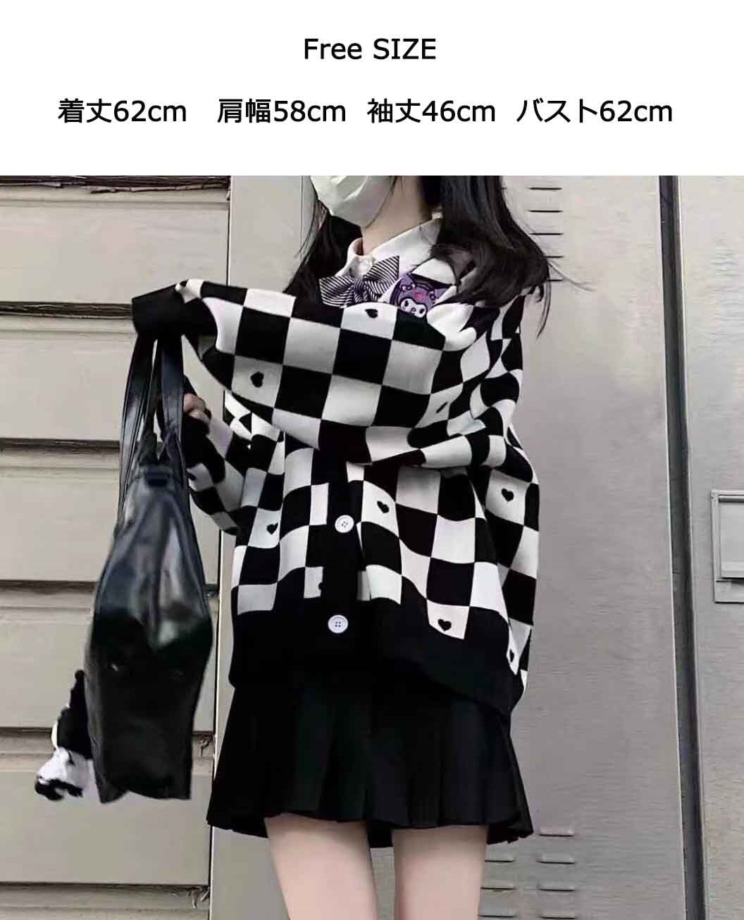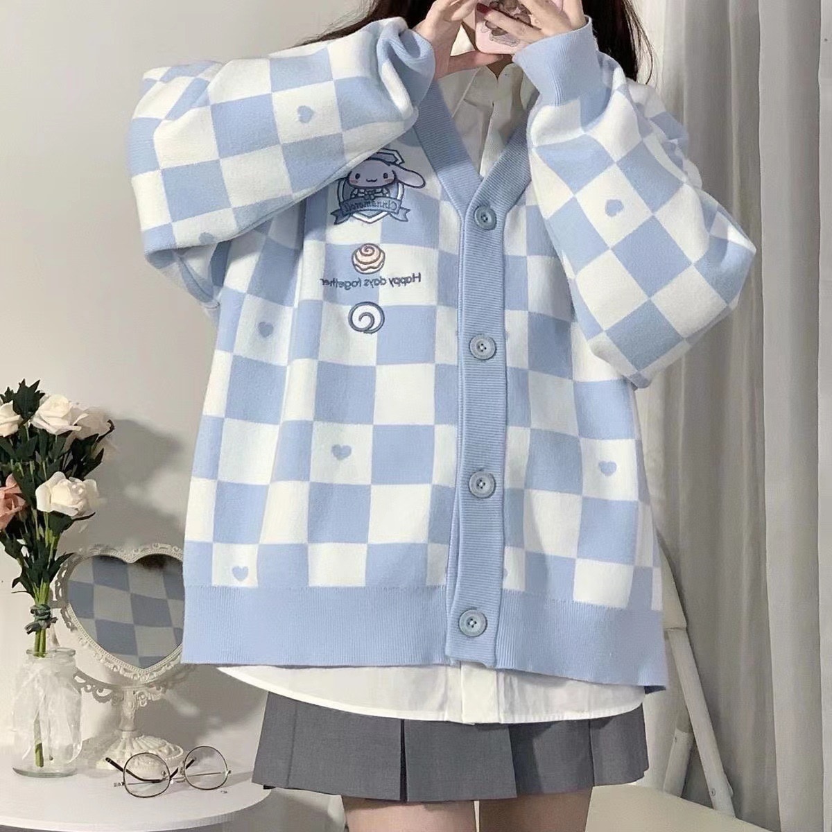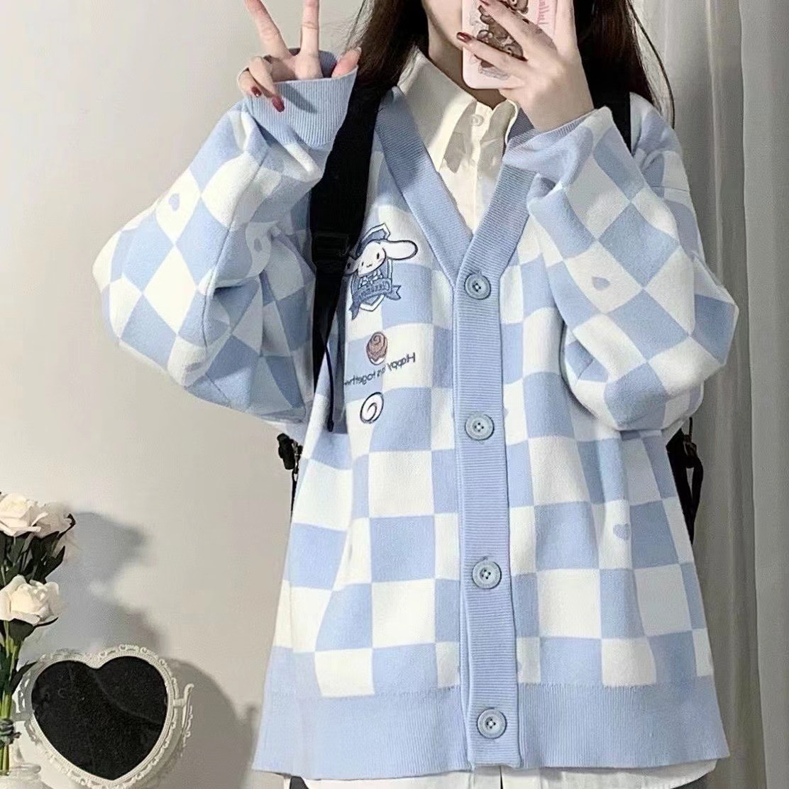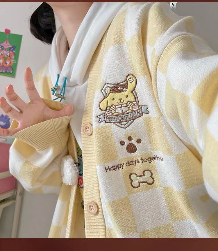サンリオ 5種類シナモロールキャラクター刺繍チェックニットカーディガン レディース薄手 前ボタン 前開き 春秋 ポムポムプリンクロミちゃんマイメロディニットセーター韓国ファッション Vネック