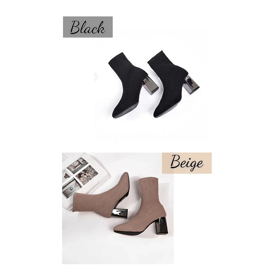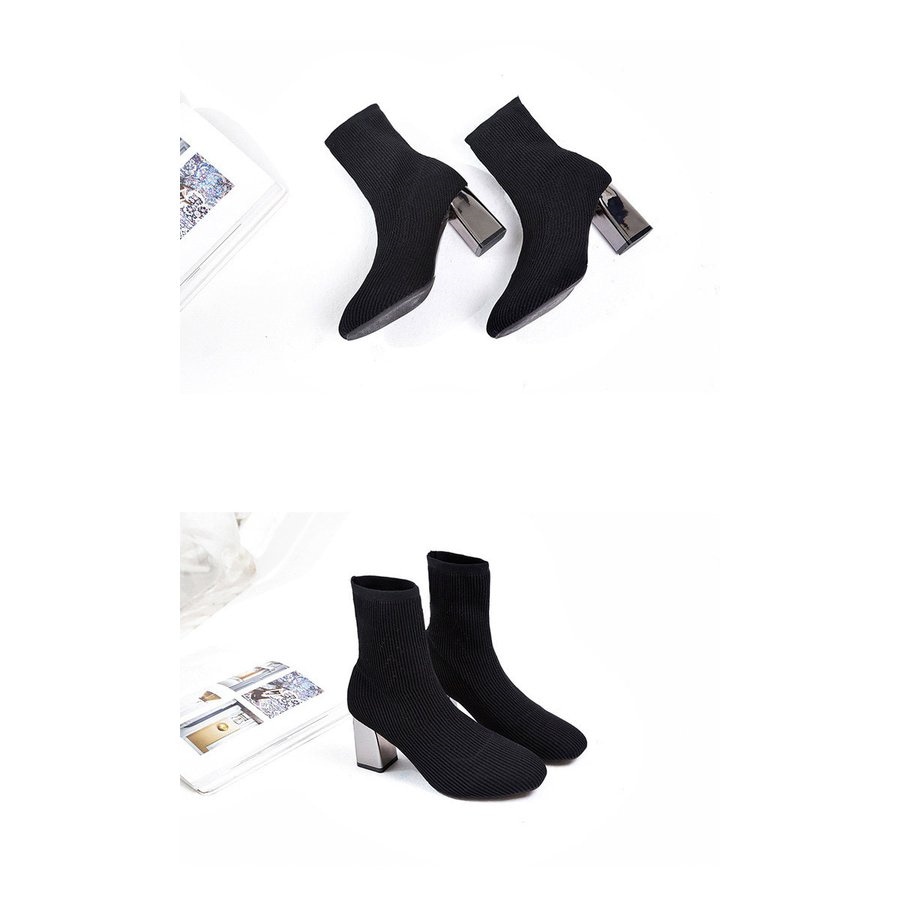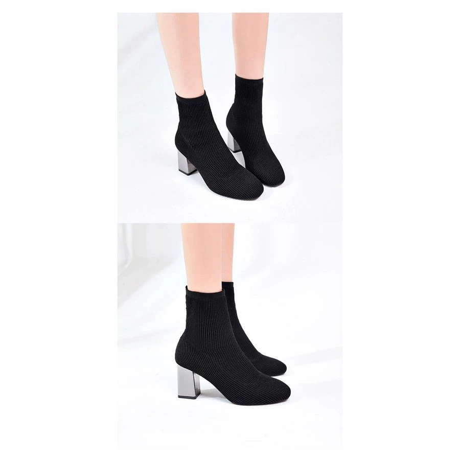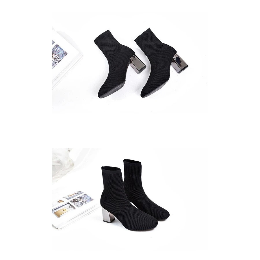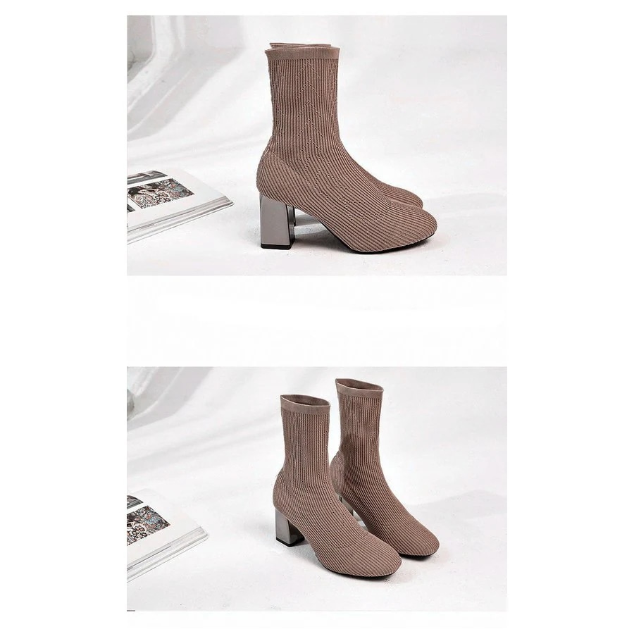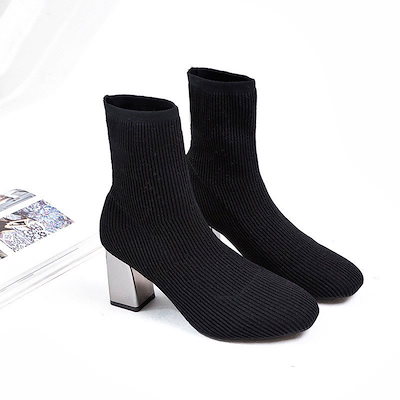 ショートブーツ ストレッチ レディース ニット ソックスブーツ スクエアトゥ チャンキーヒール 太ヒ ショート ミドルブーツ
