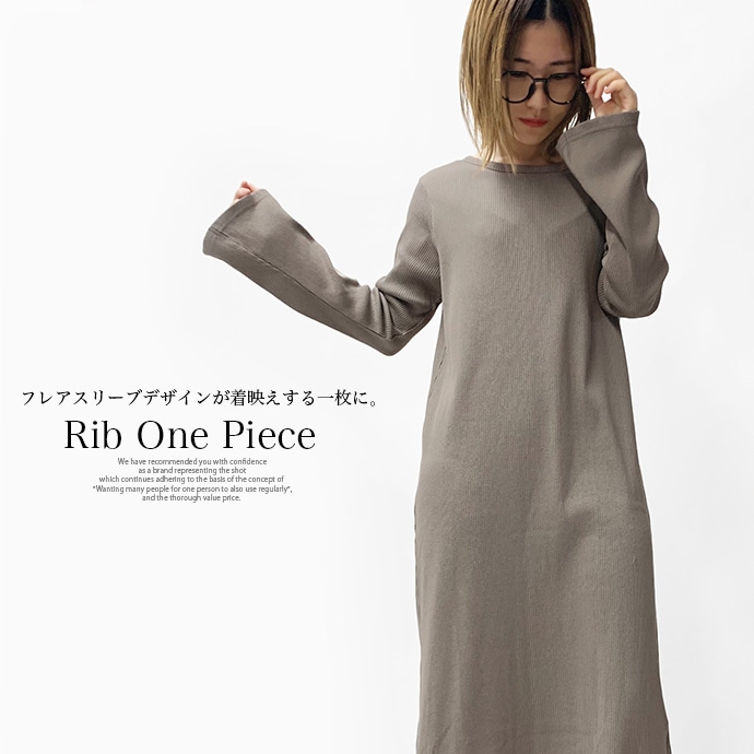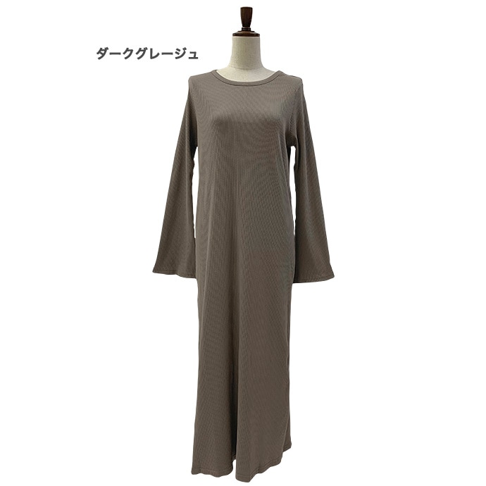 ワンピース ロングワンピース ロング丈 リブ カットソー 長袖 無地 フレアスリーブ クルーネック 綿100% コットン ストレッチ 伸縮性 通気性 洗える 春 秋 レディース
