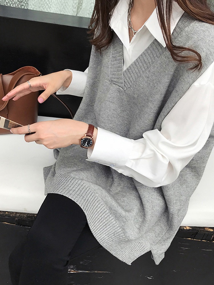 ニュースタイル オシャレ Vネックスリット ベスト 百掛け ゆったり 着痩せ トップス ニットベスト ロングベスト 通勤 ベスト