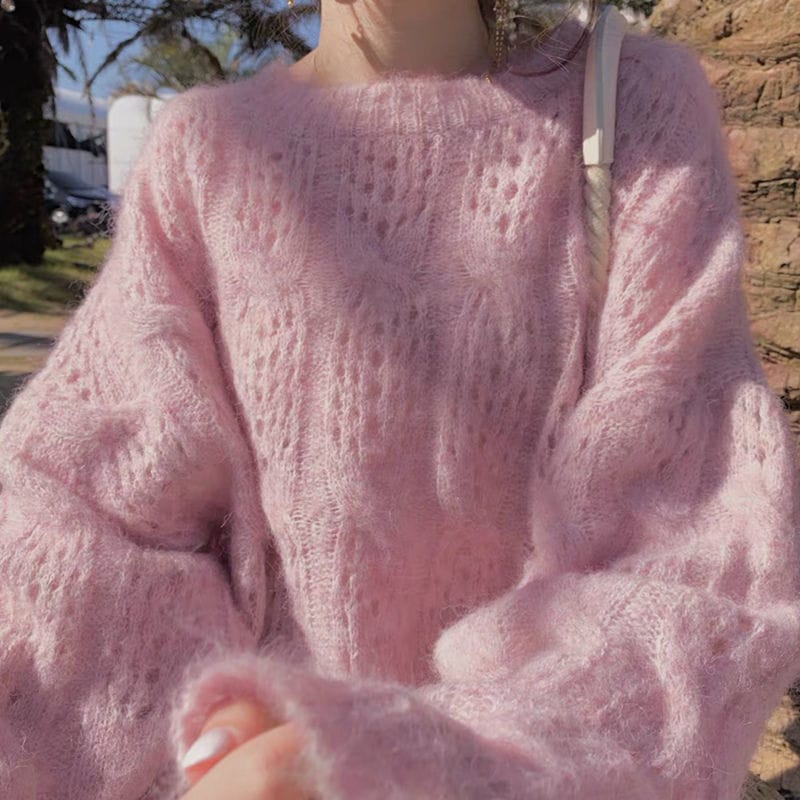 ピンクの馬海毛透かし編みセーター春と秋の外に着るゆったりとした気だるい風の甘い超仙薄ニット ニット